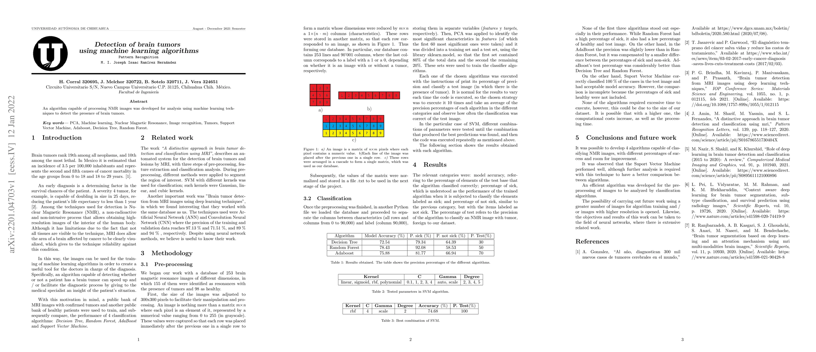 An algorithm capable of processing NMR images was developed for analysis using machine learning techniques to detect the presence of brain tumors.
