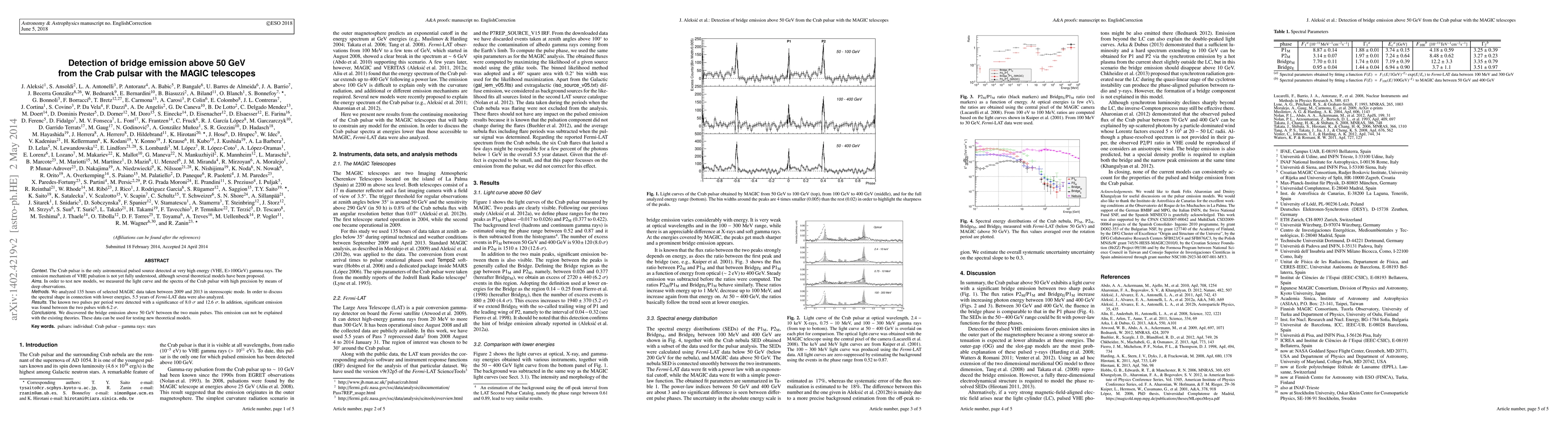 The MAGIC telescopes detected bridge emission above 50 GeV between the two main pulses of the Crab pulsar, a phenomenon not explained by existing theories, providing new data for testing advanced models of VHE pulsation mechanisms.