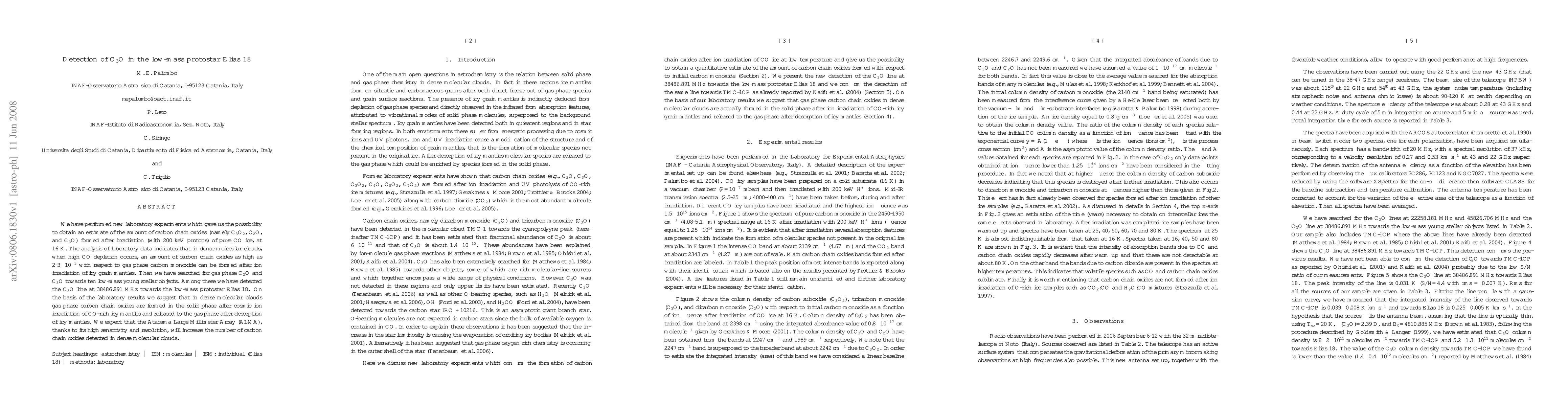 We have performed new laboratory experiments which gave us the possibility to obtain an estimate of the amount of carbon chain oxides (namely C3O2, C2O, and C3O) formed after irradiation (with 200 keV protons) of pure CO ice, at 16 K. The analysis of laboratory data indicates that in dense molecular clouds, when high CO depletion occurs, an amount of carbon chain oxides as high as 2-3x10^-3 with respect to gas phase carbon monoxide can be formed after ion irradiation of icy grain mantles. Then we have searched for gas phase C2O and C3O towards ten low-mass young stellar objects. Among these we have detected the C3O line at 38486.891 MHz towards the low-mass protostar Elias 18. On the basis of the laboratory results we suggest that in dense molecular clouds gas phase carbon chain oxides are formed in the solid phase after cosmic ion irradiation of CO-rich icy mantles and released to the gas phase after desorption of icy mantles. We expect that the Atacama Large Millimeter Array (ALMA), thanks to its high sensitivity and resolution, will increase the number of carbon chain oxides detected in dense molecular clouds.