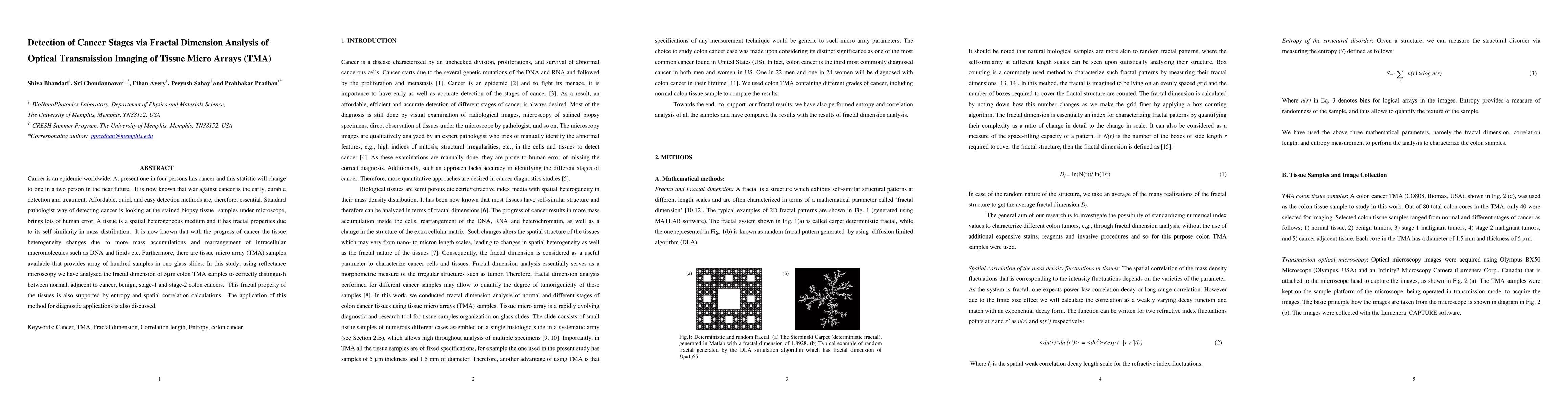 This paper proposes a method for detecting different stages of colon cancer using fractal dimension analysis of optical transmission imaging on tissue microarrays. The study demonstrates the ability to distinguish between normal, benign, and cancerous tissue stages by analyzing the fractal properties, supported by entropy and spatial correlation calculations, aiming to provide an affordable and error-free diagnostic tool.