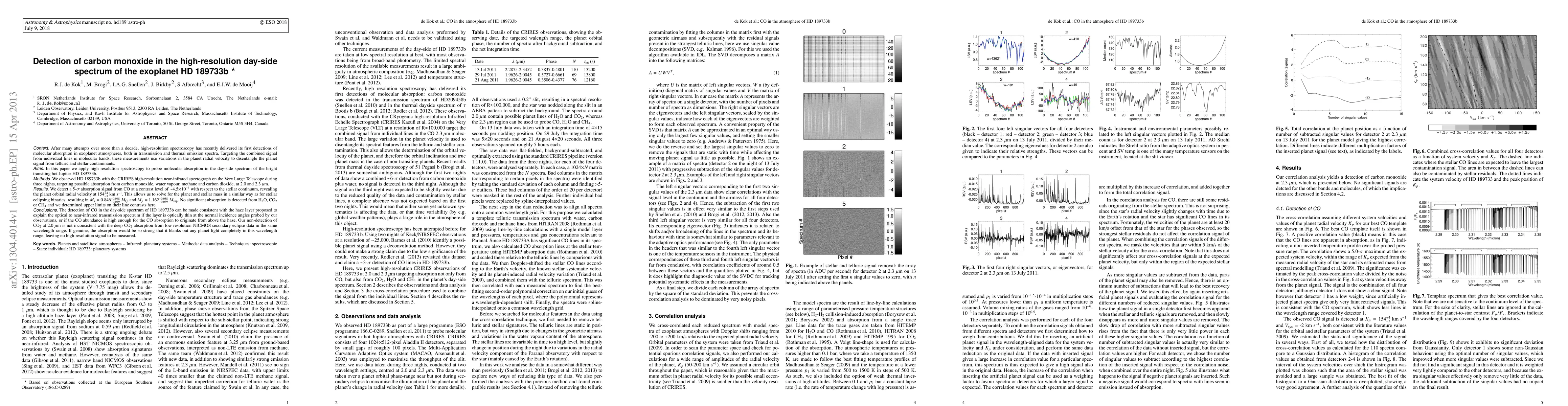 This paper reports the first high-resolution detection of carbon monoxide (CO) in the day-side spectrum of the exoplanet HD 189733b using the CRIRES spectrograph. The detection provides insights into the planet's atmospheric composition and mass, while non-detections of H2O, CO2, and CH4 offer constraints on their abundances.