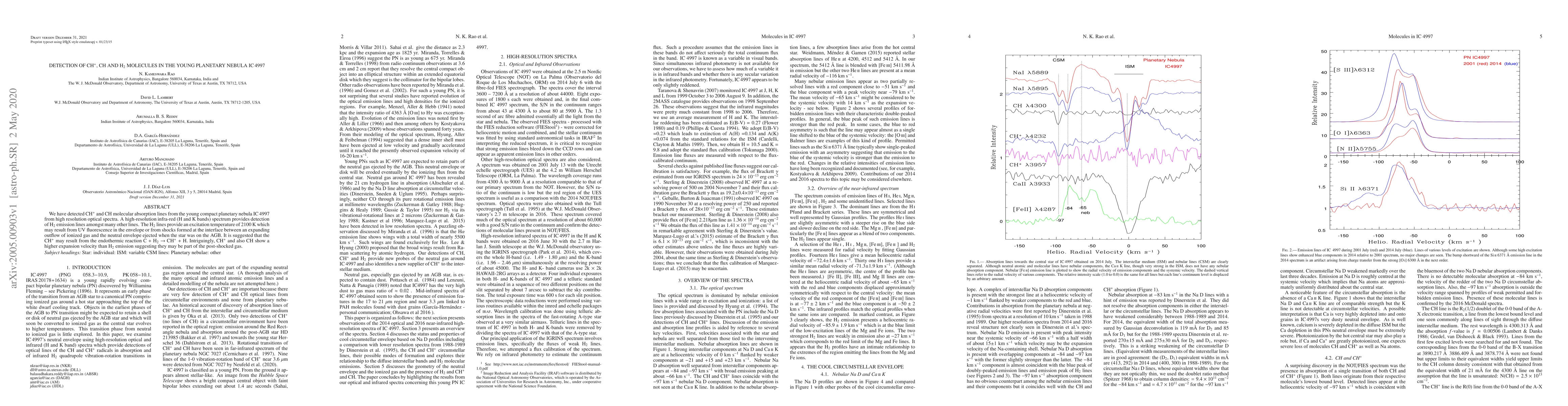 We have detected CH$^{+}$ and CH molecular absorption lines from the young compact planetary nebula IC 4997 from high resolution optical spectra. A high-resolution infra-red (H and K bands) spectrum provides detection of H$_2$ emission lines amongst many other lines. The H$_2$ lines provide an excitation temperature of 2100 K which may result from UV fluorescence in the envelope or from shocks formed at the interface between an expanding outflow of ionized gas and the neutral envelope ejected when the star was on the AGB. It is suggested that the CH$^+$ may result from the endothermic reaction C + H$_2$ $\rightarrow$ CH$^+$ + H. Intriguingly, CH$^{+}$ and also CH show a higher expansion velocity than H$_{\rm 2}$ emission suggesting they may be part of the post-shocked gas.