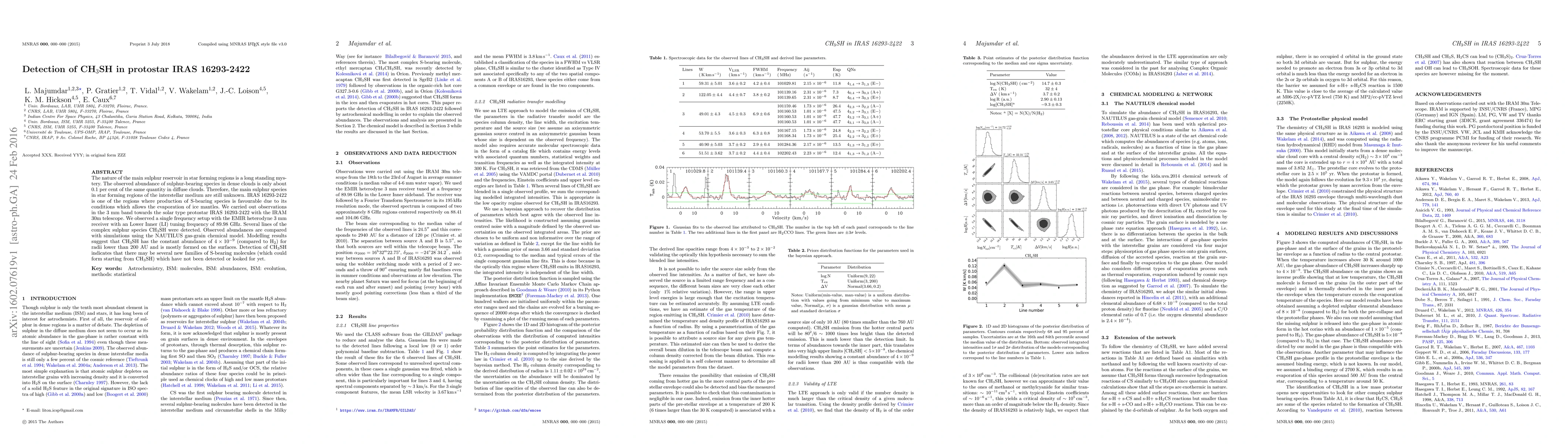 The nature of the main sulphur reservoir in star forming regions is a long standing mystery. The observed abundance of sulphur-bearing species in dense clouds is only about 0.1 per cent of the same quantity in diffuse clouds. Therefore, the main sulphur species in star forming regions of the interstellar medium are still unknown. IRAS 16293-2422 is one of the regions where production of S-bearing species is favourable due to its conditions which allows the evaporation of ice mantles. We carried out observations in the 3 mm band towards the solar type protostar IRAS 16293-2422 with the IRAM 30m telescope. We observed a single frequency setup with the EMIR heterodyne 3 mm receiver with an Lower Inner (LI) tuning frequency of 89.98 GHz. Several lines of the complex sulphur species CH3SH were detected. Observed abundances are compared with simulations using the NAUTILUS gas-grain chemical model. Modelling results suggest that CH3SH has the constant abundance of 4e-9 (compared to H2) for radii lower than 200 AU and is mostly formed on the surfaces. Detection of CH3SH indicates that there may be several new families of S-bearing molecules (which could form starting from CH3SH) which have not been detected or looked for yet.