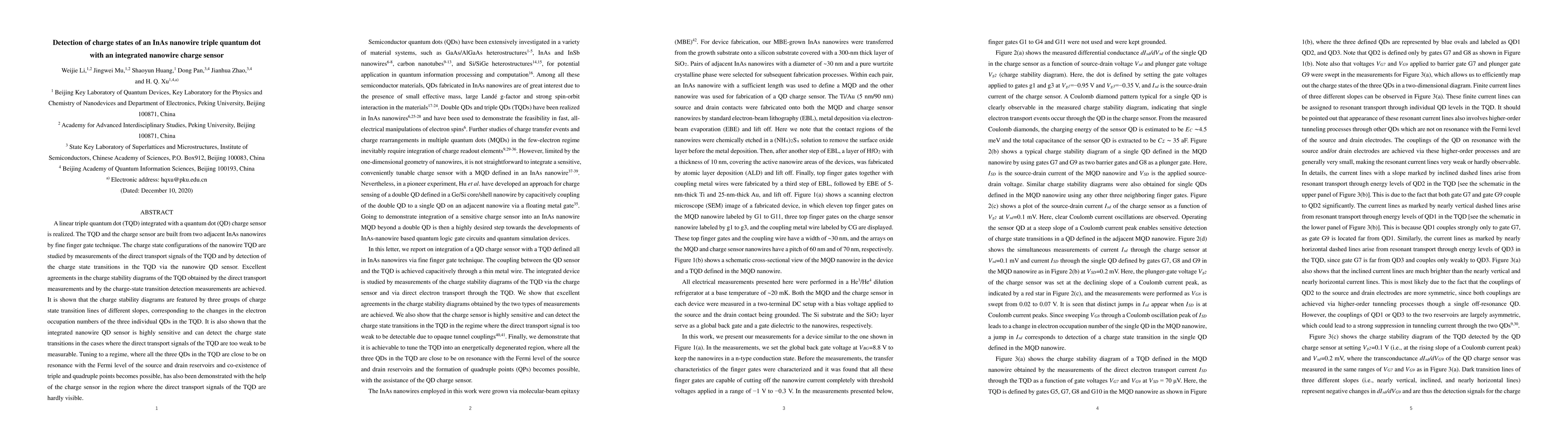 Researchers created a nanowire triple quantum dot with an integrated sensor that accurately detects charge state transitions and achieves excellent agreement between direct transport measurements and sensor detection.