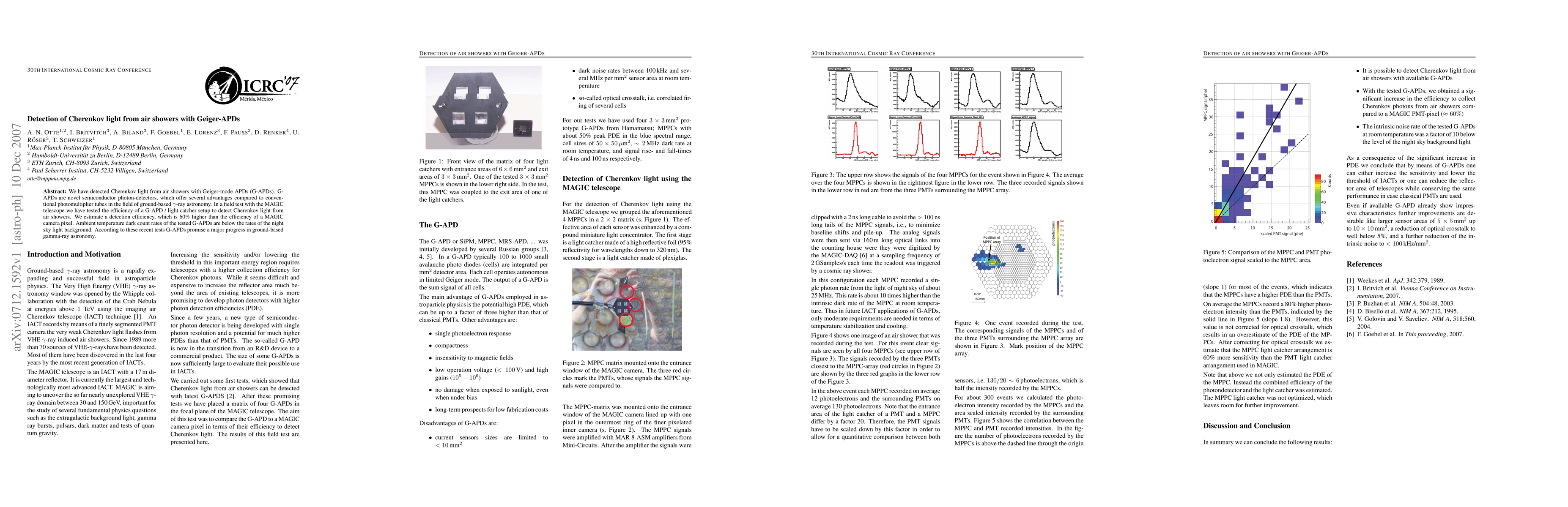 This study demonstrates the detection of Cherenkov light from air showers using Geiger-mode APDs (G-APDs), which show a 60% higher detection efficiency compared to MAGIC camera pixels. The tests suggest G-APDs could significantly advance ground-based gamma-ray astronomy due to their lower dark count rates.