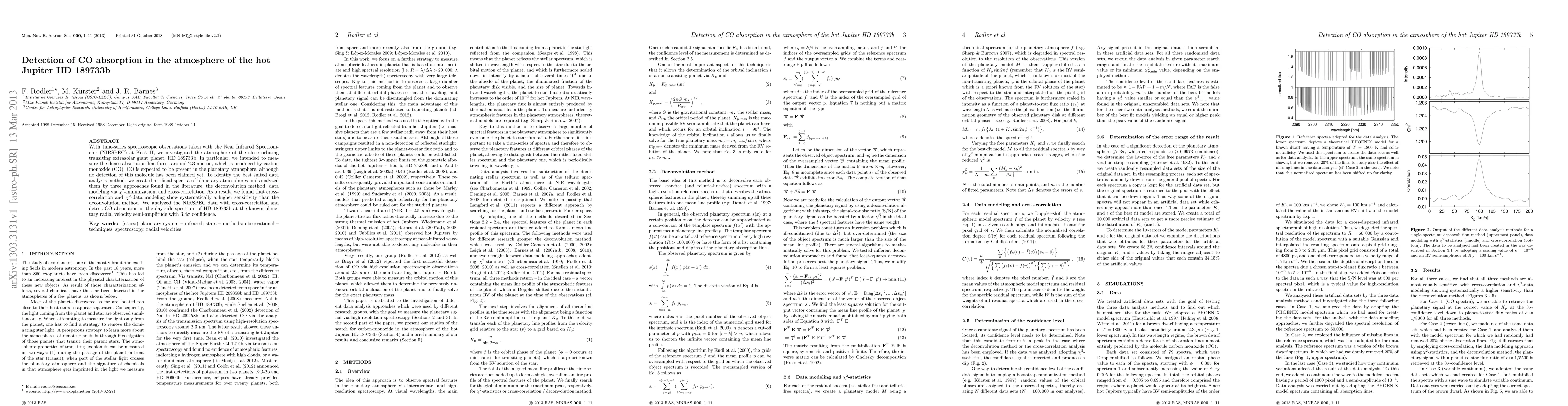 This study detected CO absorption in the atmosphere of the hot Jupiter HD 189733b using NIRSPEC at Keck II, identifying it with cross-correlation analysis at 3.4 sigma confidence. The research compared three data analysis methods, finding cross-correlation and chi^2-data modeling to be more sensitive than deconvolution.