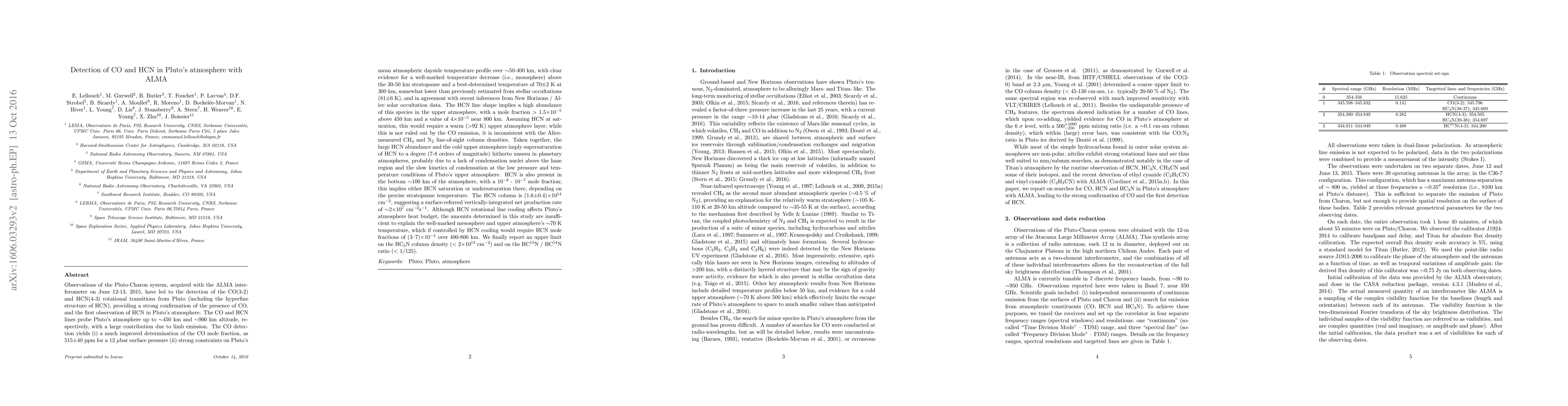 This study, using ALMA observations, detected CO and HCN in Pluto's atmosphere, confirming CO presence and observing HCN for the first time. The findings suggest a CO mole fraction of 515±40 ppm and a cold upper atmosphere with HCN supersaturation, though insufficient to explain the observed temperature profile.