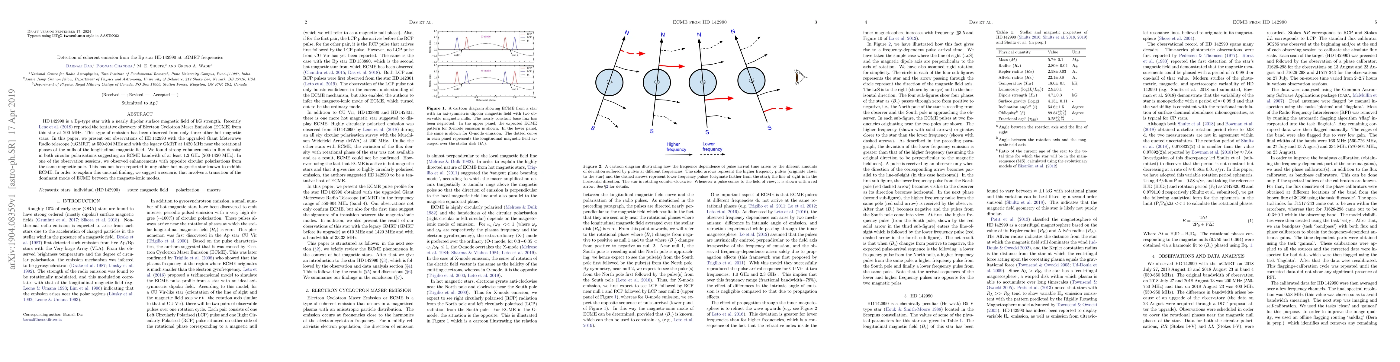 HD 142990 is a Bp-type star with a nearly dipolar surface magnetic field of kG strength. Recently Lenc et al. (2018) reported the tentative discovery of Electron Cyclotron Maser Emission (ECME) from this star at 200 MHz. This type of emission has been observed from only three other hot magnetic stars. In this paper, we present our observations of HD 142990 with the upgraded Giant Metrewave Radio telescope (uGMRT) at 550-804 MHz and with the legacy GMRT at 1420 MHz near the rotational phases of the nulls of the longitudinal magnetic field. We found strong enhancements in flux density in both circular polarisations suggesting an ECME bandwith of at least 1.2 GHz (200-1420 MHz). In one of the observation sessions, we observed enhancements with opposite circular polarisations from the same magnetic pole. This has not been reported in any other hot magnetic star known to exhibit ECME. In order to explain this unusual finding, we suggest a scenario that involves a transition of the dominant mode of ECME between the magneto-ionic modes.