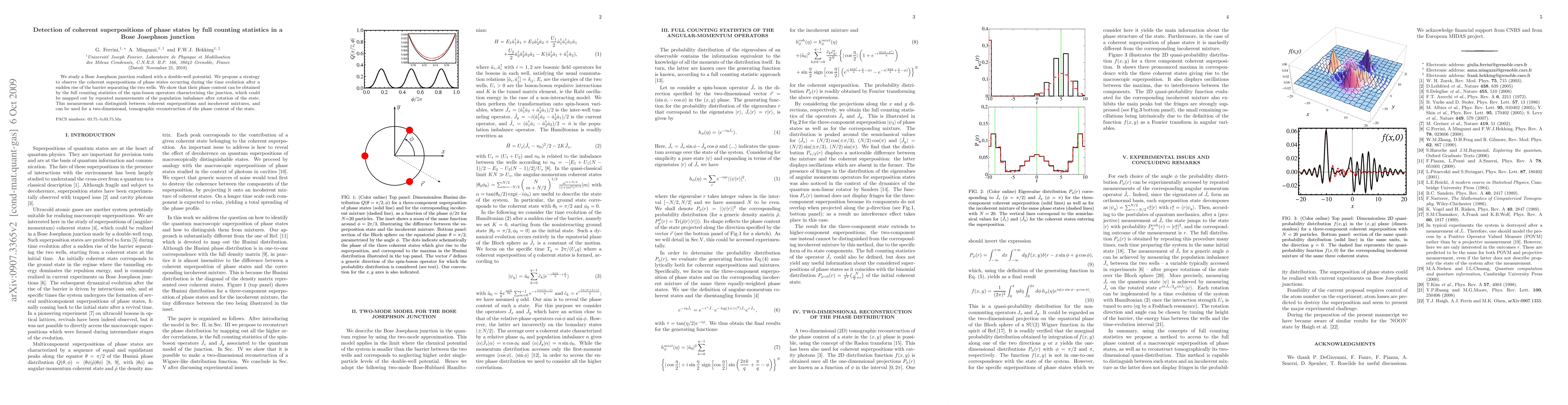 This paper proposes a method to detect coherent superpositions of phase states in a Bose Josephson junction using full-counting statistics of spin-boson operators. The approach involves measuring population imbalance after state rotation, enabling distinction between coherent superpositions and incoherent mixtures for tomographic reconstruction of phase states.