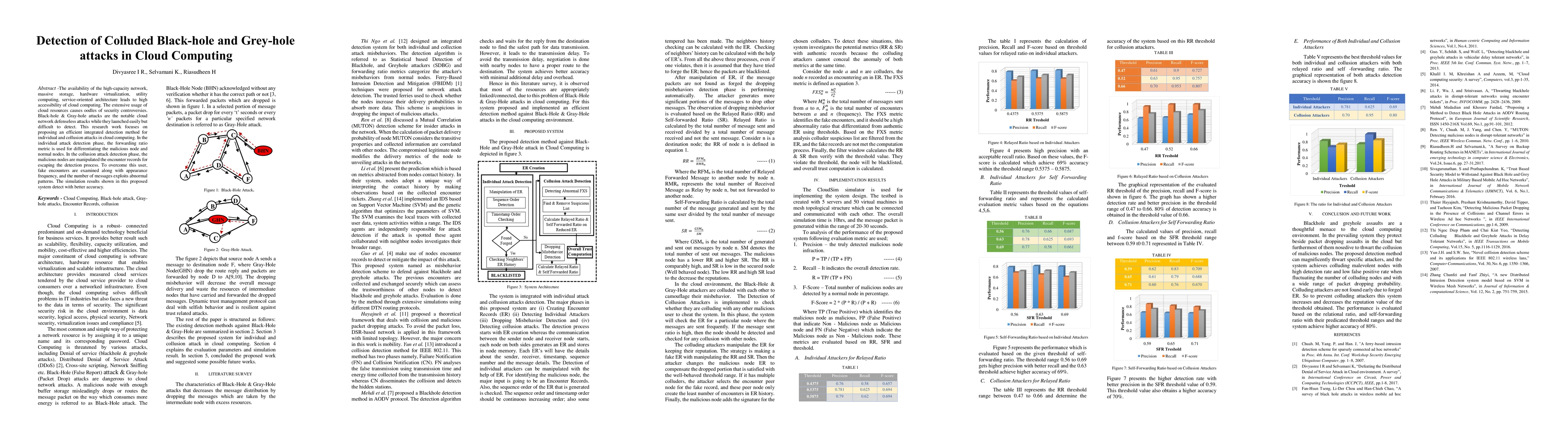 The availability of the high-capacity network, massive storage, hardware virtualization, utility computing, service-oriented architecture leads to high accessibility of cloud computing. The extensive usage of cloud resources causes oodles of security controversies. Black-hole & Gray-hole attacks are the notable cloud network defenseless attacks while they launched easily but difficult to detect. This research work focuses on proposing an efficient integrated detection method for individual and collusion attacks in cloud computing. In the individual attack detection phase, the forwarding ratio metric is used for differentiating the malicious node and normal nodes. In the collusion attack detection phase, the malicious nodes are manipulated the encounter records for escaping the detection process. To overcome this user, fake encounters are examined along with appearance frequency, and the number of messages exploits abnormal patterns. The simulation results shown in this proposed system detect with better accuracy.
