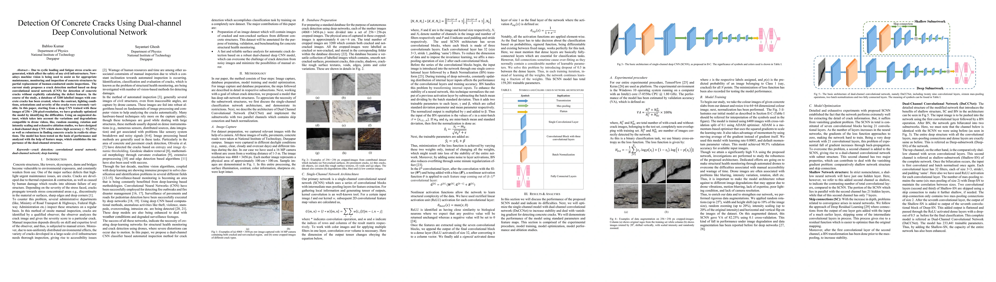 This paper proposes a dual-channel deep convolutional neural network for detecting concrete cracks in civil infrastructure, trained on a diverse dataset of 3200 labelled images. The model achieves high accuracy (~92.25%) and robustness, validated through extensive ablation studies and feature map analysis.