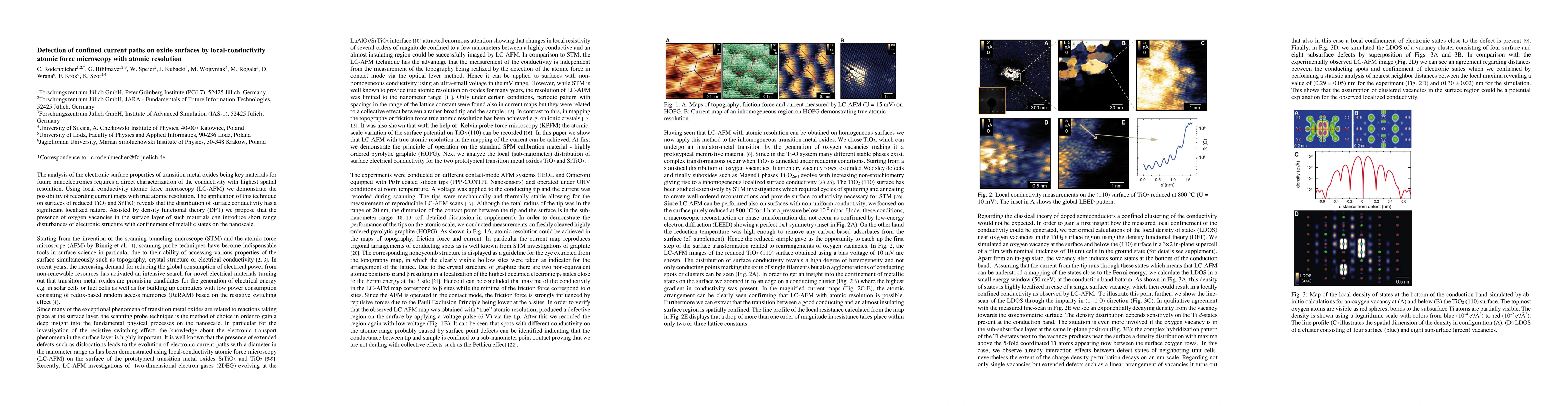 This study utilizes local conductivity atomic force microscopy (LC-AFM) to achieve atomic resolution in mapping current paths on transition metal oxide surfaces, revealing localized conductivity influenced by oxygen vacancies. Density functional theory supports the idea that these vacancies introduce nanoscale confinement of metallic states.