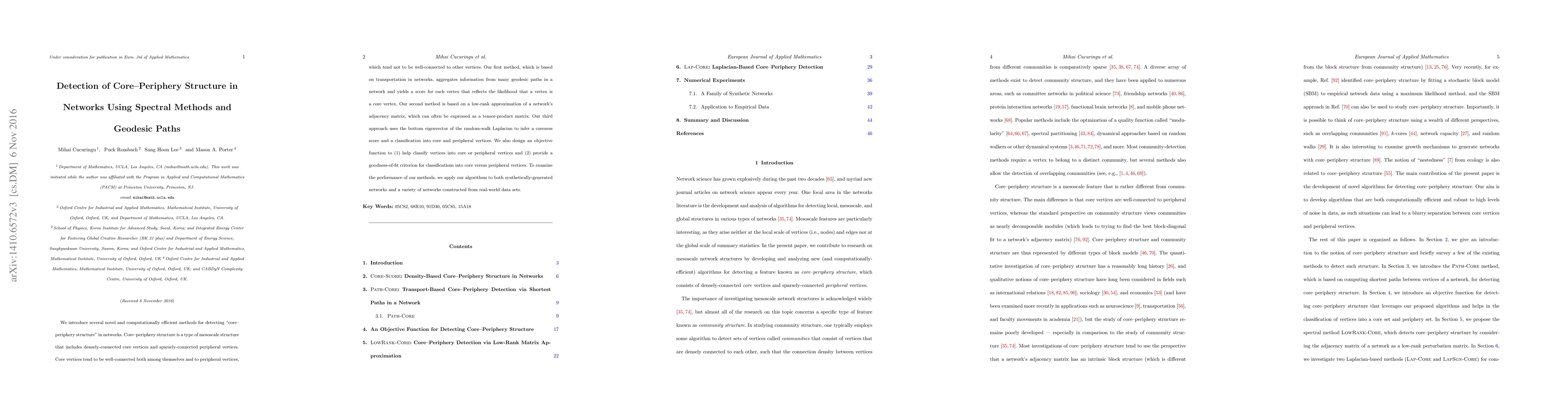We introduce several novel and computationally efficient methods for detecting "core--periphery structure" in networks. Core--periphery structure is a type of mesoscale structure that includes densely-connected core vertices and sparsely-connected peripheral vertices. Core vertices tend to be well-connected both among themselves and to peripheral vertices, which tend not to be well-connected to other vertices. Our first method, which is based on transportation in networks, aggregates information from many geodesic paths in a network and yields a score for each vertex that reflects the likelihood that a vertex is a core vertex. Our second method is based on a low-rank approximation of a network's adjacency matrix, which can often be expressed as a tensor-product matrix. Our third approach uses the bottom eigenvector of the random-walk Laplacian to infer a coreness score and a classification into core and peripheral vertices. We also design an objective function to (1) help classify vertices into core or peripheral vertices and (2) provide a goodness-of-fit criterion for classifications into core versus peripheral vertices. To examine the performance of our methods, we apply our algorithms to both synthetically-generated networks and a variety of networks constructed from real-world data sets.