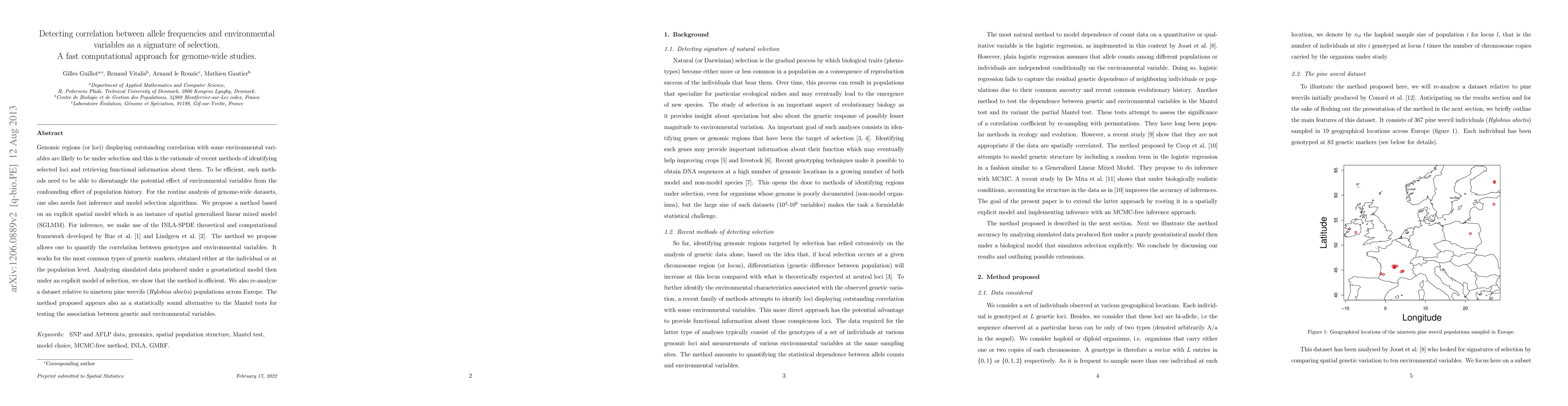 Genomic regions (or loci) displaying outstanding correlation with some environmental variables are likely to be under selection and this is the rationale of recent methods of identifying selected loci and retrieving functional information about them. To be efficient, such methods need to be able to disentangle the potential effect of environmental variables from the confounding effect of population history. For the routine analysis of genome-wide datasets, one also needs fast inference and model selection algorithms. We propose a method based on an explicit spatial model which is an instance of spatial generalized linear mixed model (SGLMM). For inference, we make use of the INLA-SPDE theoretical and computational framework developed by Rue et al. (2009) and Lindgren et al (2011). The method we propose allows one to quantify the correlation between genotypes and environmental variables. It works for the most common types of genetic markers, obtained either at the individual or at the population level. Analyzing simulated data produced under a geostatistical model then under an explicit model of selection, we show that the method is efficient. We also re-analyze a dataset relative to nineteen pine weevils (Hylobius abietis}) populations across Europe. The method proposed appears also as a statistically sound alternative to the Mantel tests for testing the association between genetic and environmental variables.