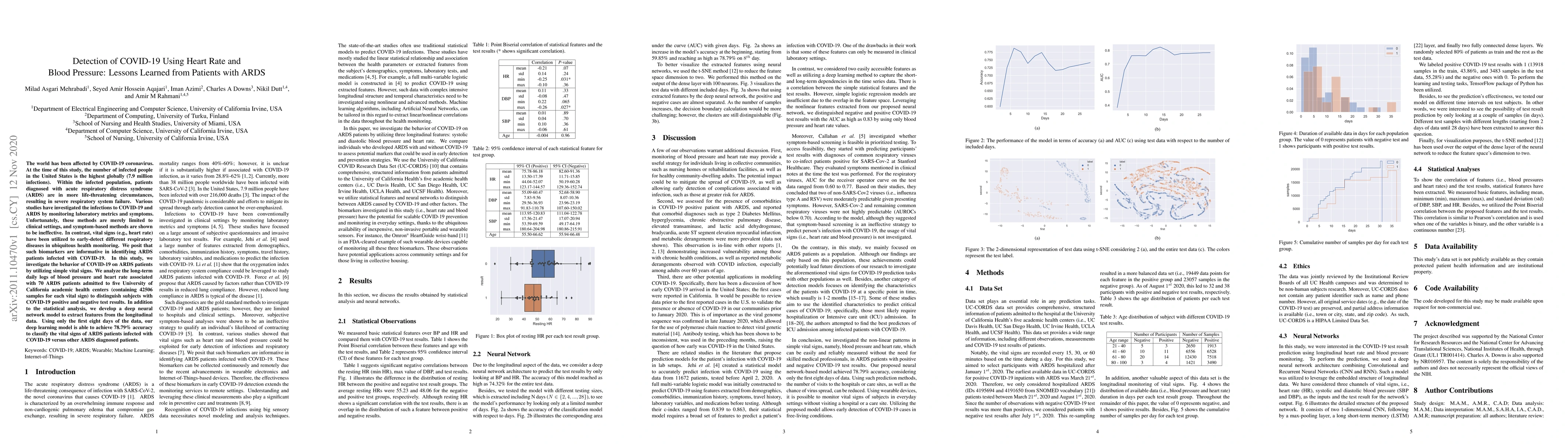 This study investigates the use of heart rate and blood pressure to detect COVID-19 in patients with acute respiratory distress syndrome (ARDS). By analyzing daily logs of vital signs from 70 ARDS patients, the researchers developed a deep neural network model that achieved 78.79% accuracy in classifying COVID-19 positive versus negative ARDS patients using only the first eight days of data.