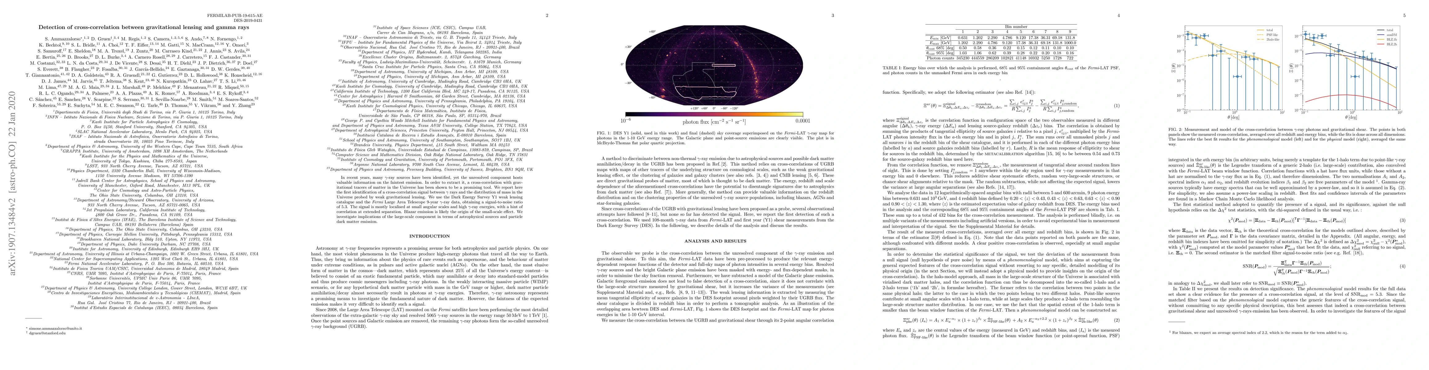 This paper reports the first identification of a cross-correlation signal between gamma rays and weak gravitational lensing, using the Dark Energy Survey Y1 catalogue and Fermi LAT data. The detected signal, with a 5.3 signal-to-noise ratio, suggests a link between gamma-ray sources and the distribution of mass in the Universe, with blazar emission likely causing the small-scale effect.