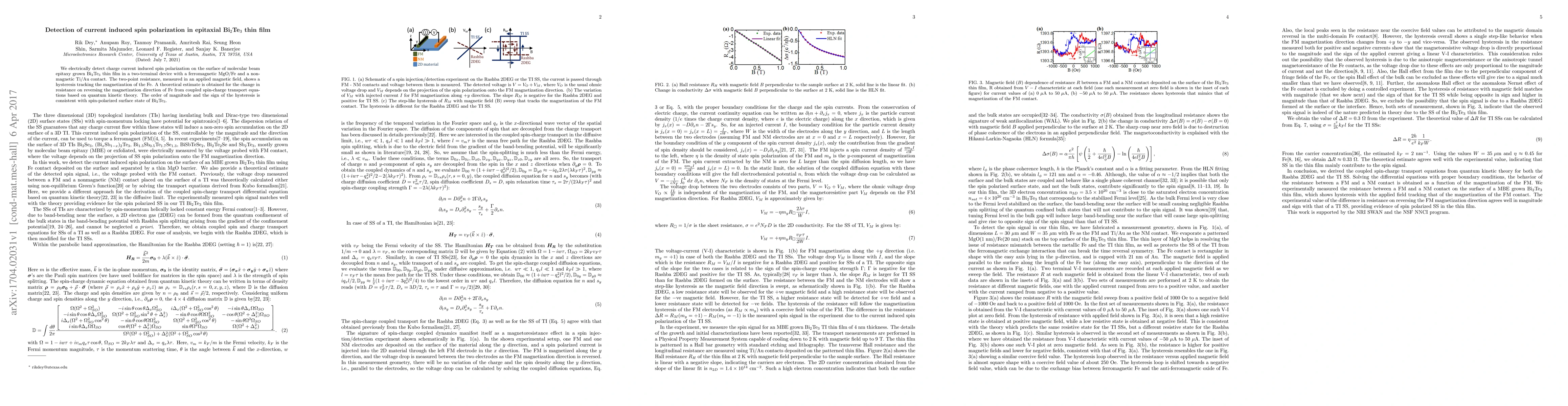 Researchers detected current-induced spin polarization in Bi$_2$Te$_3$ thin films using a two-terminal device with magnetic contacts. The findings suggest the presence of a spin-polarized surface state in Bi$_2$Te$_3$.