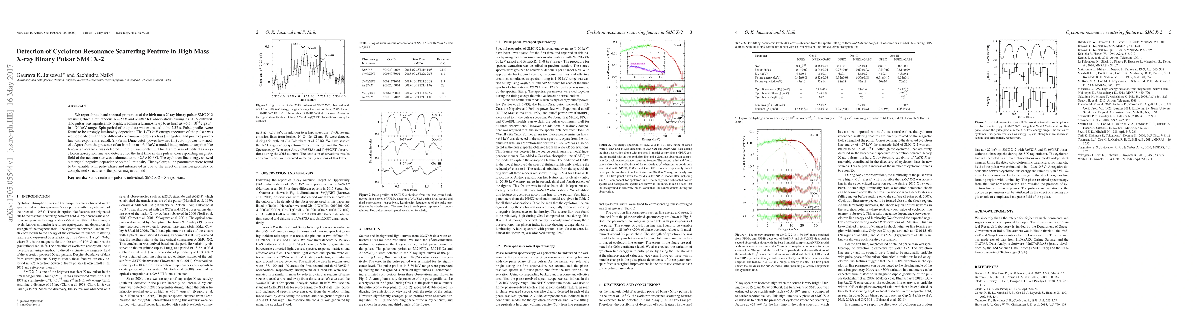 We report broadband spectral properties of the high mass X-ray binary pulsar SMC X-2 by using three simultaneous $NuSTAR$ and $Swift$/XRT observations during its 2015 outburst. The pulsar was significantly bright, reaching a luminosity up to as high as $\sim$5.5$\times$10$^{38}$~ergs~s$^{-1}$ in 1-70 keV range. Spin period of the pulsar was estimated to be 2.37 s. Pulse profiles were found to be strongly luminosity dependent. The 1-70 keV energy spectrum of the pulsar was well described with three different continuum models such as (i) negative and positive power-law with exponential cutoff, (ii) Fermi-Dirac cutoff power-law and (iii) cutoff power-law models. Apart from the presence of an iron line at $\sim$6.4 keV, a model independent absorption like feature at $\sim$27 keV was detected in the pulsar spectrum. This feature was identified as a cyclotron absorption line and detected for the first time in this pulsar. Corresponding magnetic field of the neutron star was estimated to be $\sim$2.3$\times$10$^{12}$ G. The cyclotron line energy showed a marginal negative dependence on the luminosity. The cyclotron line parameters were found to be variable with pulse phase and interpreted as due to the effect of emission geometry or complicated structure of the pulsar magnetic field.