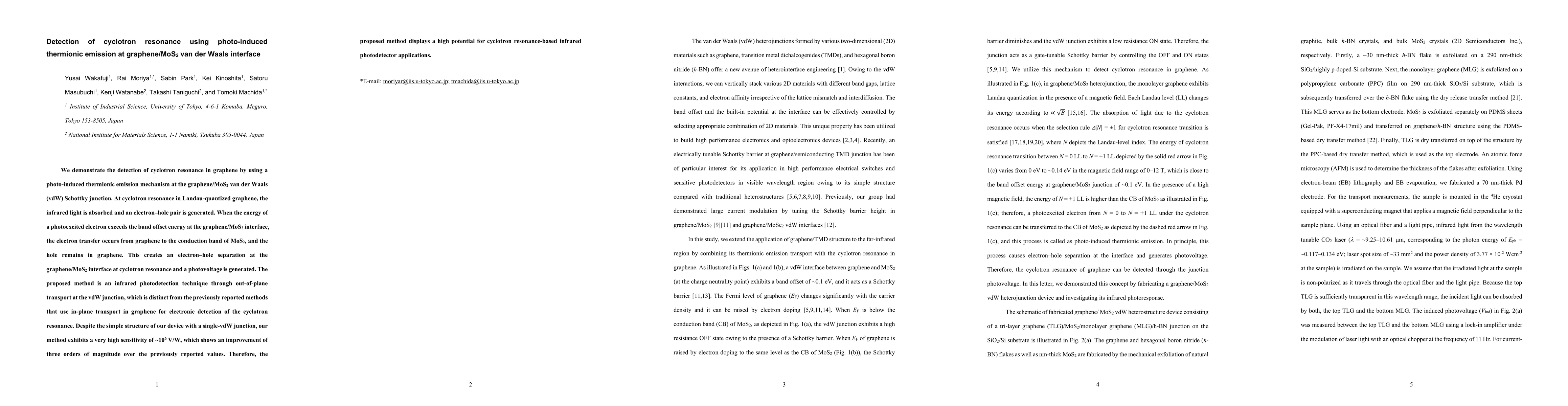 The paper demonstrates the detection of cyclotron resonance in graphene using photo-induced thermionic emission at a graphene/MoS2 van der Waals interface, achieving significantly higher sensitivity (10^6 V/W) than previous in-plane transport methods. This new out-of-plane transport technique holds great promise for infrared photodetector applications.