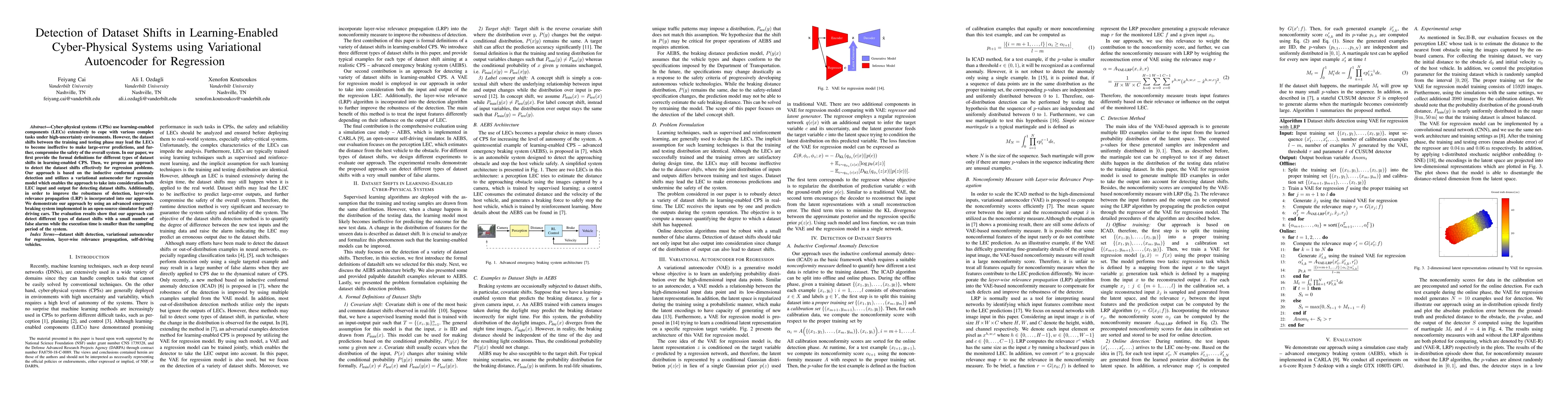 This paper proposes a method to detect dataset shifts in learning-enabled cyber-physical systems using a variational autoencoder for regression, combined with inductive conformal anomaly detection and layer-wise relevance propagation for robustness. The approach is demonstrated in an emergency braking system for self-driving cars, showing effective detection with minimal false alarms and low execution time.