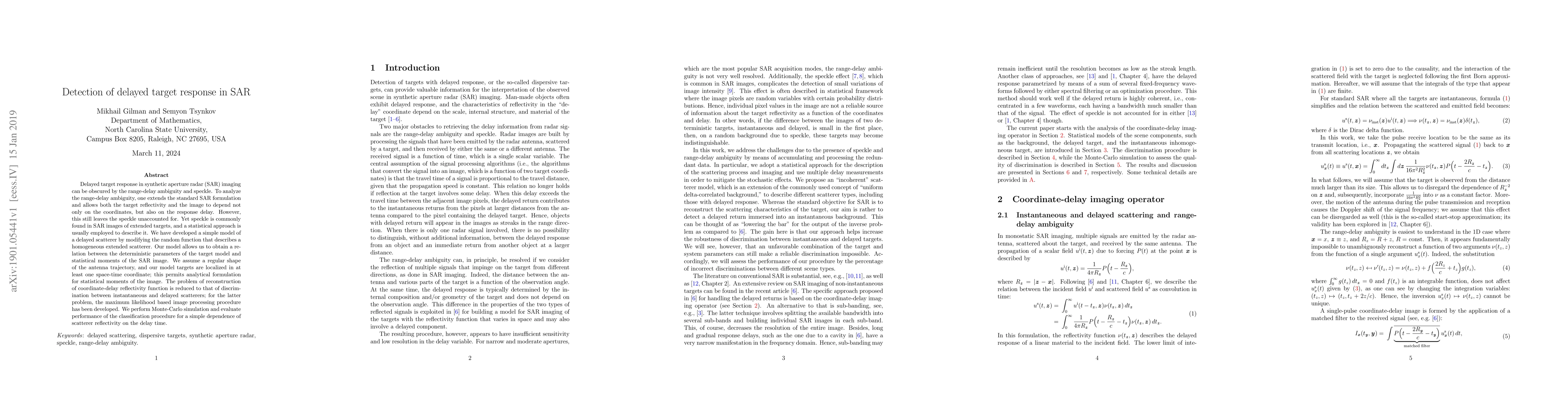 This paper develops a model to detect delayed target response in SAR imaging, addressing range-delay ambiguity and speckle. It introduces a statistical approach to differentiate between instantaneous and delayed scatterers using a maximum likelihood-based image processing method, validated through Monte-Carlo simulations.