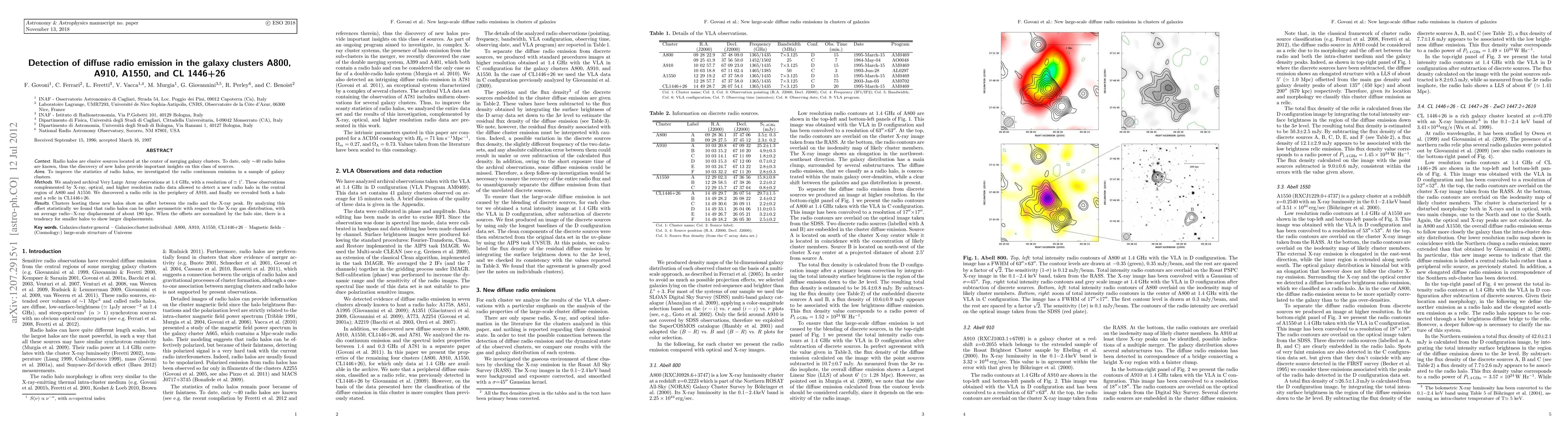 Radio halos are elusive sources located at the center of merging galaxy clusters. To date, only about 40 radio halos are known, thus the discovery of new halos provide important insights on this class of sources. To improve the statistics of radio halos, we investigated the radio continuum emission in a sample of galaxy clusters. We analyzed archival Very Large Array observations at 1.4 GHz, with a resolution of about 1 arcmin. These observations complemented by X-ray, optical, and higher resolution radio data allowed to detect a new radio halo in the central region of A800 and A1550. We discovered a radio relic in the periphery of A910, and finally we revealed both a halo and a relic in CL1446+26.Clusters hosting these new halos show an offset between the radio and the X-ray peak. By analyzing this offset statistically we found that radio halos can be quite asymmetric with respect to the X-ray gas distribution, with an average radio - X-ray displacement of about 180 kpc. When the offsets are normalized by the halo size, there is a tendency for smaller halos to show larger displacements.