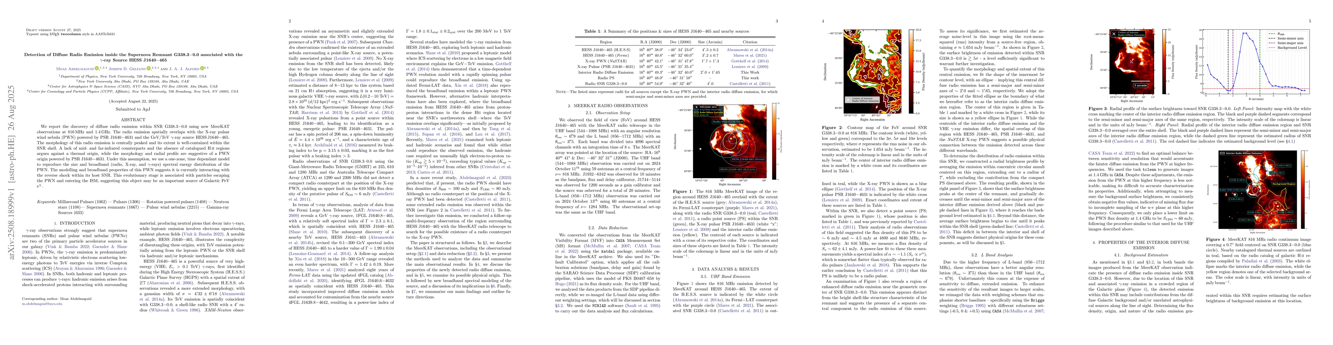 We report the discovery of diffuse radio emission within SNR G338.3-0.0 using new MeerKAT observations at 816 MHz and 1.4 GHz. The radio emission spatially overlaps with the X-ray pulsar wind nebula (PWN) powered by PSR J1640-4631 and the GeV/TeV gamma-ray source HESS J1640-465. The morphology of this radio emission is centrally peaked and its extent is well-contained within the SNR shell. A lack of mid- and far-infrared counterparts and the absence of catalogued H II regions argues against a thermal origin, while the morphology and radial profile are suggestive of a PWN origin powered by PSR J1640-4631. Under this assumption, we use a one-zone, time dependant model to reproduce the size and broadband (radio, X-ray, and gamma-rays) spectral energy distribution of the PWN. The modelling and broadband properties of this PWN suggests it is currently interacting with the reverse shock within its host SNR. This evolutionary stage is associated with particles escaping the PWN and entering the ISM, suggesting this object may be an important source of Galactic PeV e+/e-