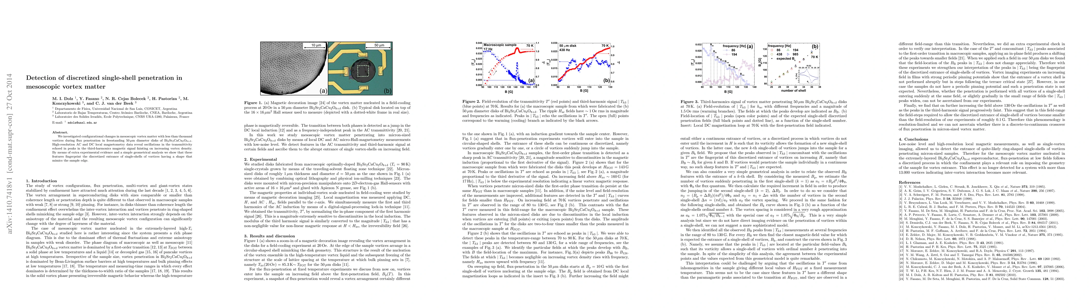 We investigated configurational changes in mesoscopic vortex matter with less than thousand vortices during flux penetration in freestanding 50 $\mu$m diameter disks of Bi$_{2}$Sr$_{2}$CaCu$_{2}$O$_{8 +\delta}$. High-resolution AC and DC local magnetometry data reveal oscillations in the transmittivity echoed in peaks in the third-harmonics magnetic signal fainting on increasing vortex density. By means of extra experimental evidence and a simple geometrical analysis we show that these features fingerprint the discretized entrance of single-shells of vortices having a shape that mimics the sample edge.