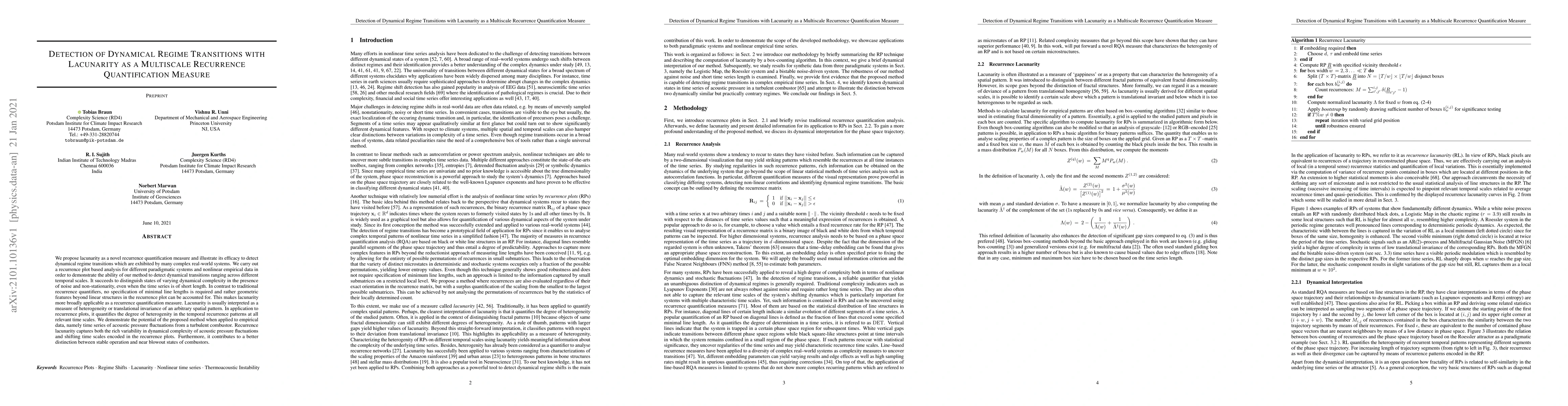 This paper introduces lacunarity as a new recurrence quantification measure to detect dynamical regime transitions in complex systems. It successfully identifies transitions across different temporal scales, distinguishing varying dynamical complexities even in noisy, non-stationary, and short time series, without requiring minimal line length specifications. The method is demonstrated on turbulent combustor data, showing improved differentiation between stable and near blowout states.