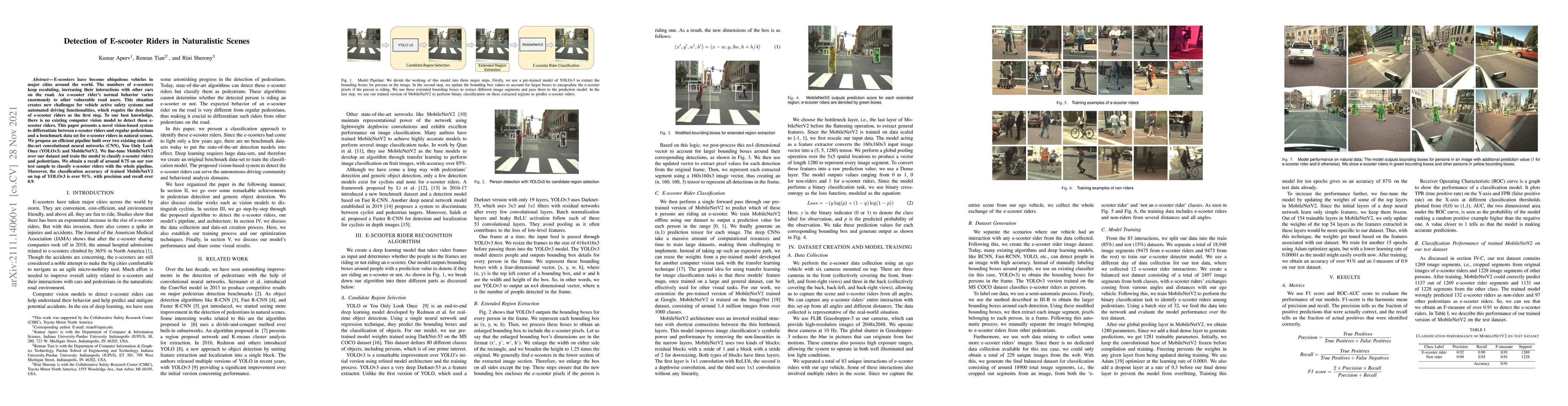 This paper presents a novel vision-based system using fine-tuned MobileNetV2 on top of YOLOv3 to detect e-scooter riders in naturalistic scenes, differentiating them from pedestrians. The proposed model achieves a high classification accuracy of over 91% with precision and recall above 0.9.