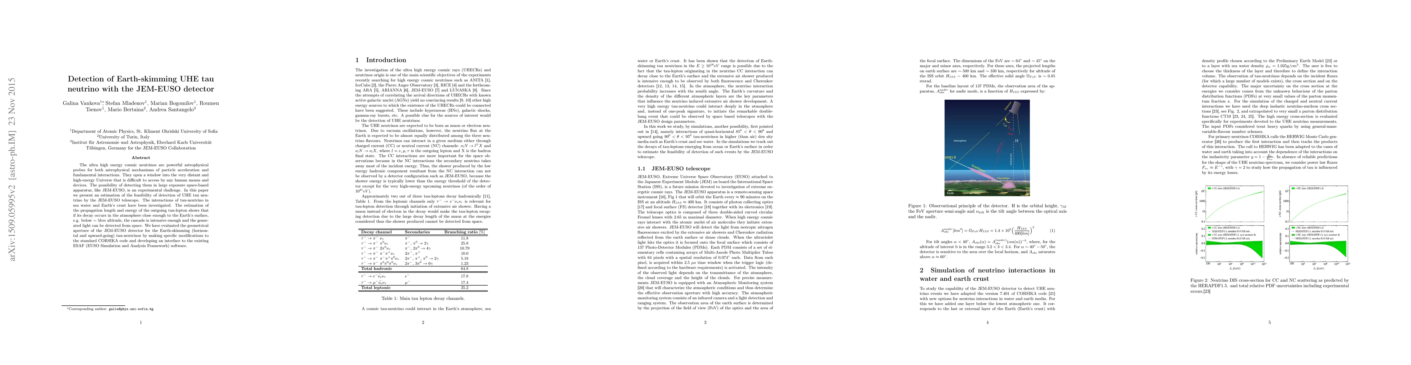 This paper estimates the feasibility of detecting ultra-high energy (UHE) tau neutrinos using the JEM-EUSO telescope, focusing on Earth-skimming events where the neutrino decays in the atmosphere close to the surface. The study finds that the generated cascade light can be detected from space if the decay occurs below ~5 km.