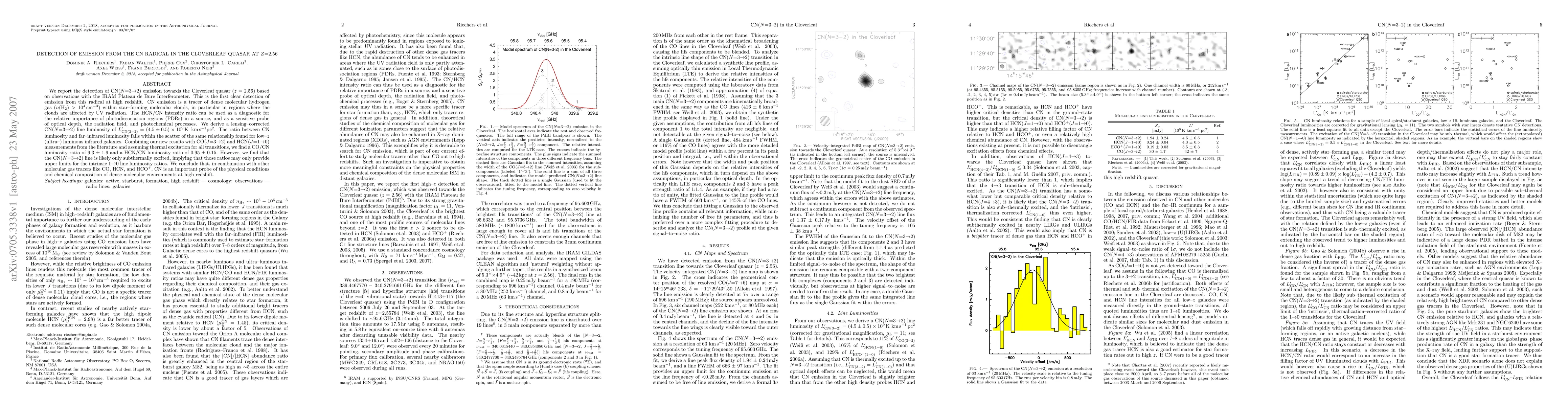 This paper reports the first detection of CN(N=3-2) emission in the Cloverleaf quasar at z=2.56, indicating dense molecular hydrogen gas in star-forming regions. The study suggests that CN emission can trace photodissociation regions and probe physical conditions, with derived luminosity ratios indicating potential upper limits for intrinsic molecular gas line luminosities.