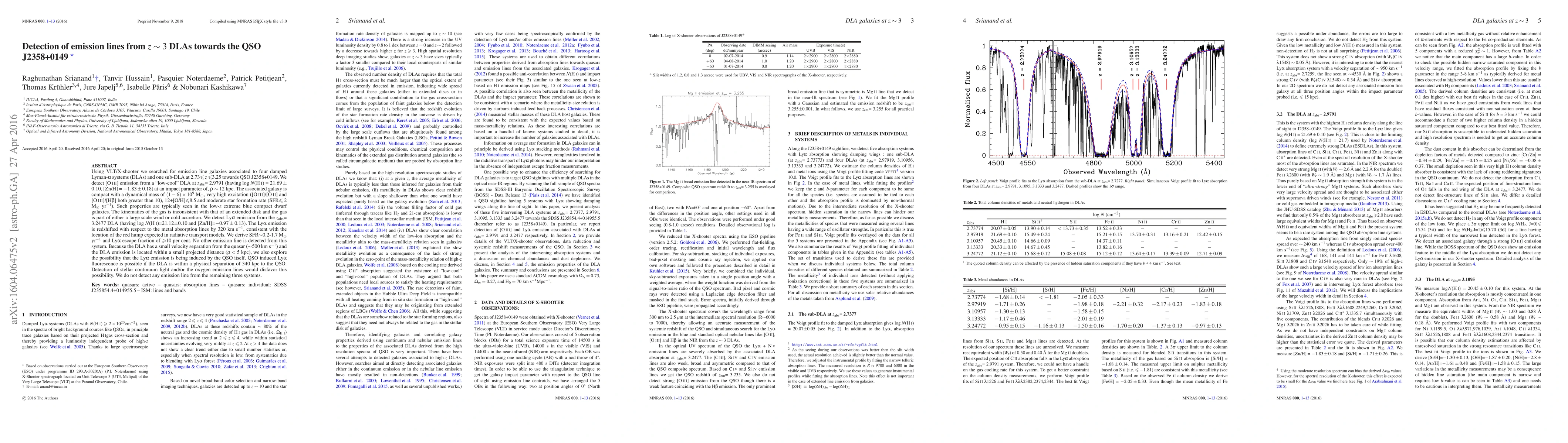The study used VLT/X-shooter to detect emission lines from high-redshift DLAs towards QSO J2358+0149, finding [O III] emission from a low-metallicity, compact galaxy at z=2.9791, and Lyα emission from a DLA at z=3.2477. The findings suggest these galaxies have properties similar to low-z blue compact dwarfs and could be part of large-scale galactic winds or cold accretion systems. The research also explores the possibility of QSO-induced Lyα fluorescence in the closer DLA system.