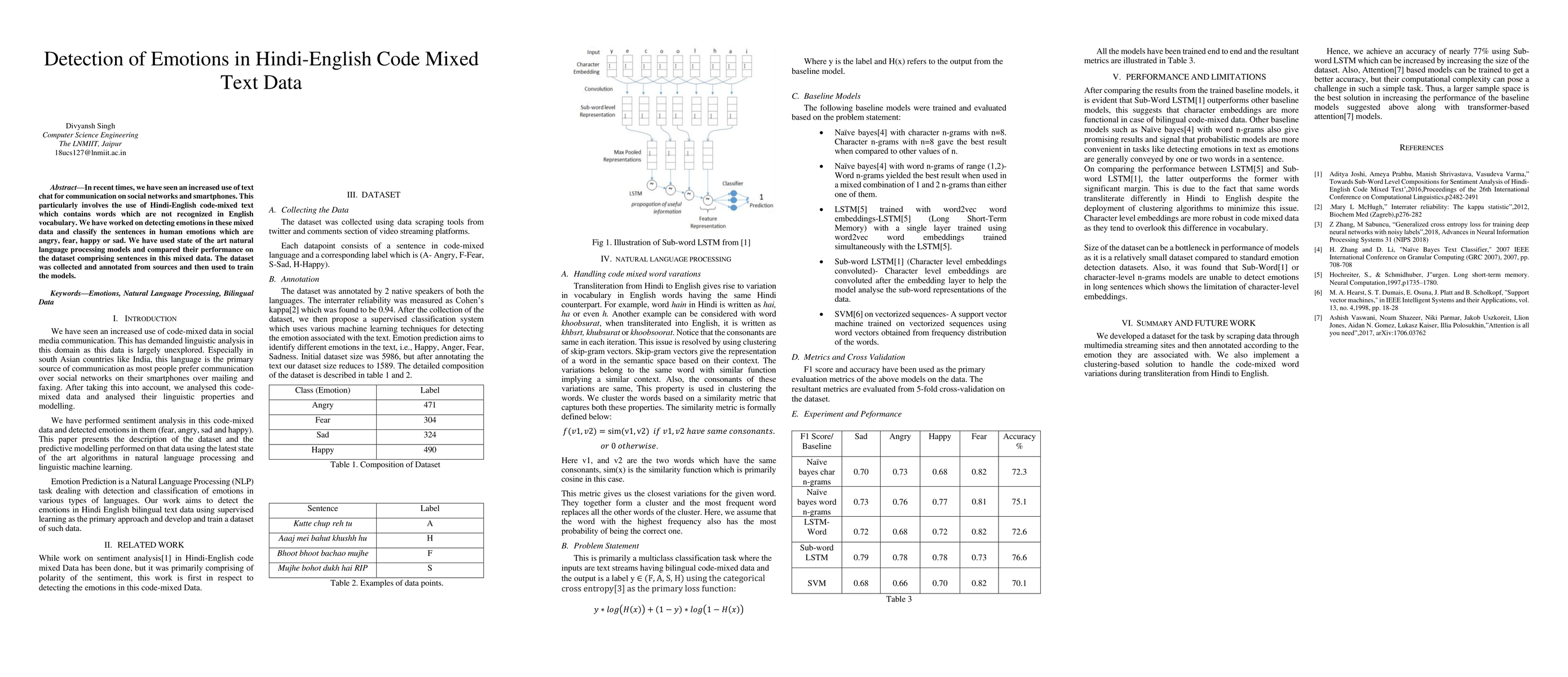 This research investigates the detection of emotions in Hindi-English code-mixed text from social networks and smartphones, using advanced NLP models to classify sentences into angry, fear, happy, or sad emotions. The study compares the performance of these models on a specifically annotated dataset.