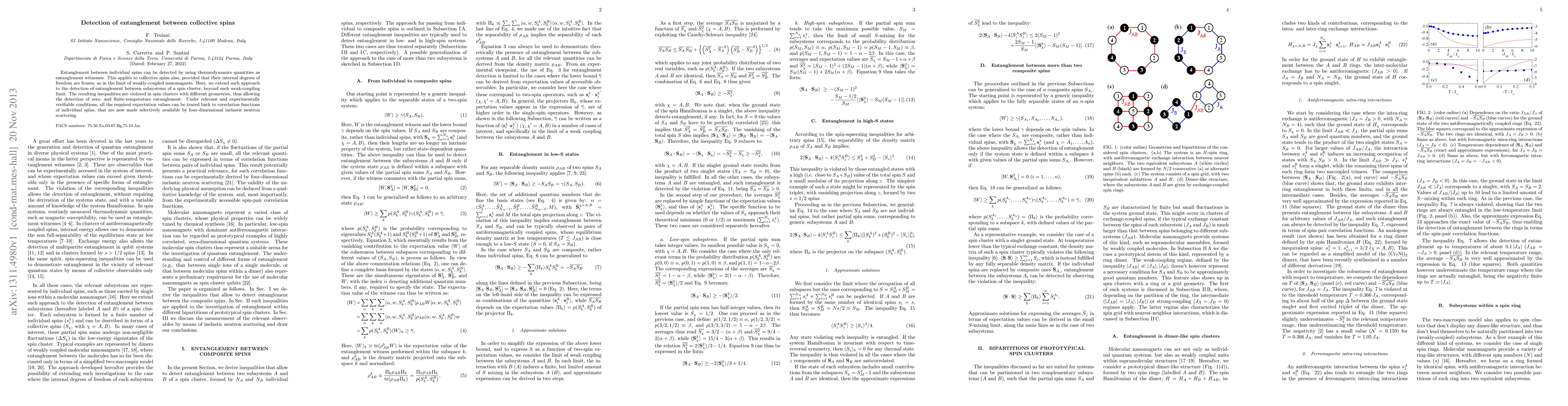 This paper proposes a method to detect entanglement between collective spins in spin clusters using thermodynamic quantities as entanglement witnesses, extending beyond weakly-coupled nanomagnets. The approach allows for the detection of entanglement at zero and finite temperatures, with experimental feasibility supported by four-dimensional inelastic neutron scattering.
