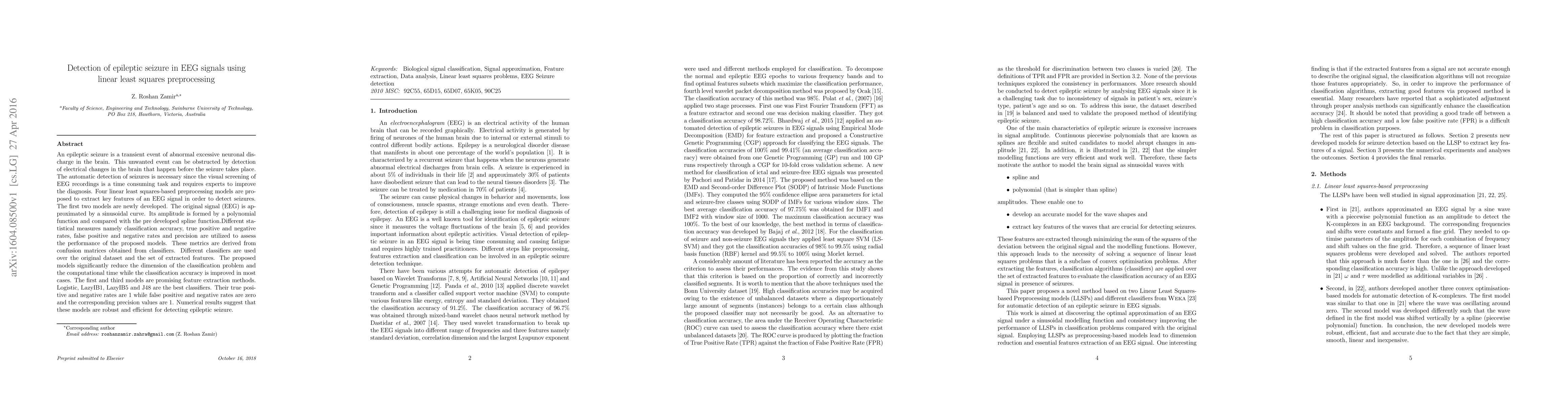 This paper proposes four linear least squares-based preprocessing models to detect epileptic seizures in EEG signals by extracting key features. The models significantly reduce classification complexity and improve accuracy, with Logistic, LazyIB1, LazyIB5, and J48 classifiers achieving perfect true positive and negative rates and precision.