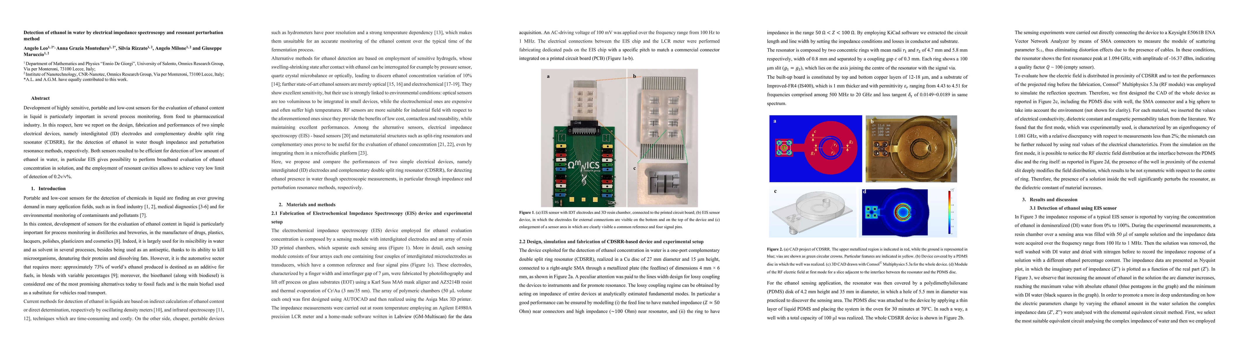 Development of highly sensitive, portable and low-cost sensors for the evaluation of ethanol content in liquid is particularly important in several process monitoring, from food to pharmaceutical industry. In this respect, here we report on the design, fabrication and performances of two simple electrical devices, namely interdigitated (ID) electrodes and complementary double split ring resonator (CDSRR), for the detection of ethanol in water though impedance and perturbation resonance methods, respectively. Both sensors resulted to be efficient for detection of low amount of ethanol in water, in particular EIS gives possibility to perform broadband evaluation of ethanol concentration in solution, and the employment of resonant cavities allows to achieve very low limit of detection of 0.2v/v%.