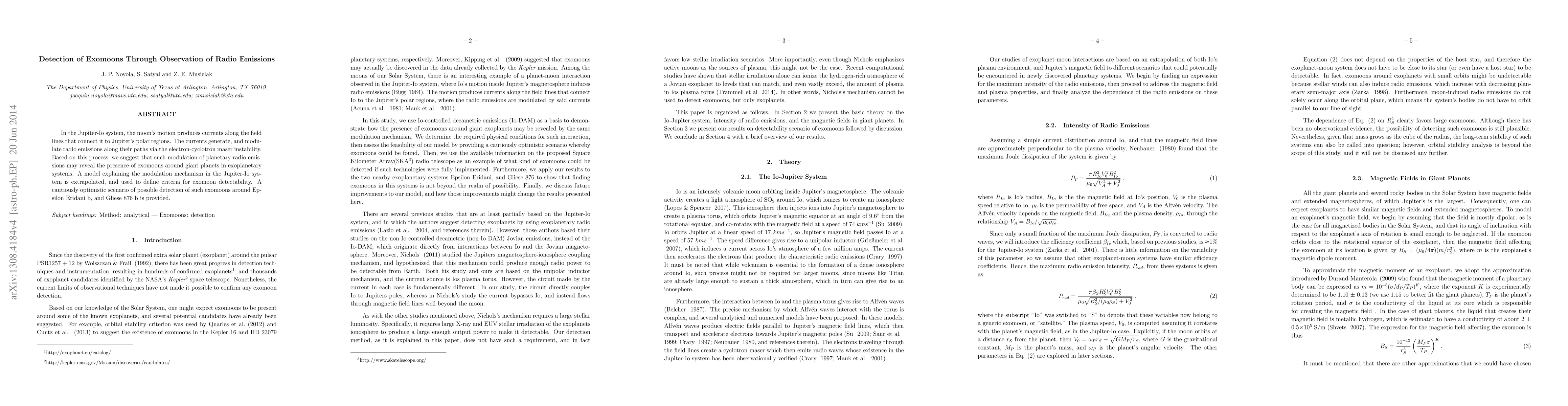 This paper proposes a method to detect exomoons by observing modulations in planetary radio emissions caused by currents generated by moon-planet interactions, similar to those in the Jupiter-Io system. It extrapolates this model to suggest potential detection of exomoons around exoplanets Epsilon Eridani b and Gliese 876 b.