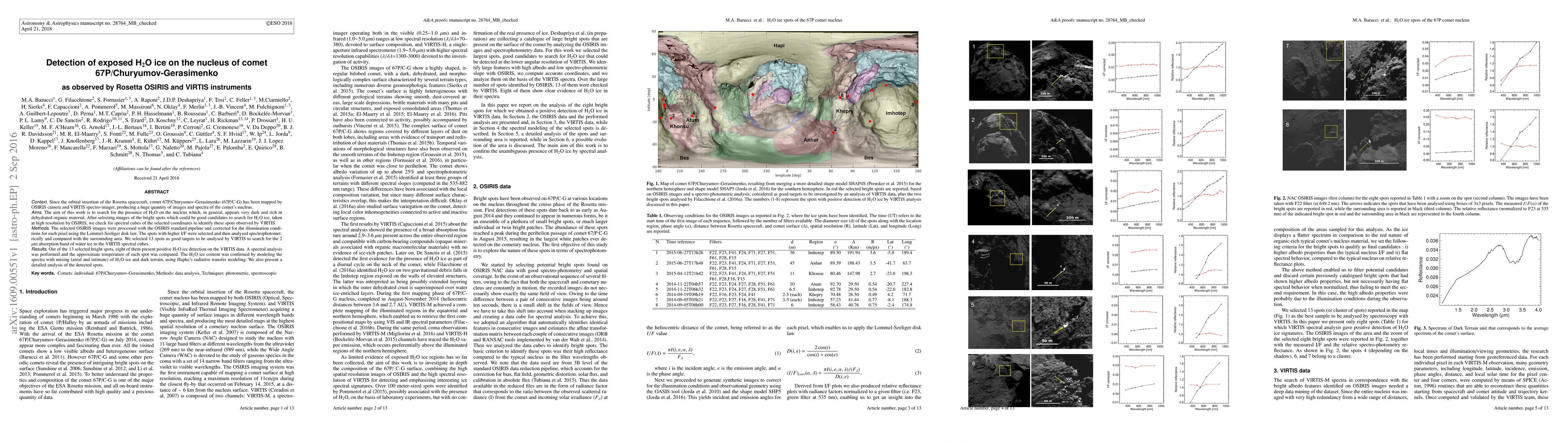 Researchers used Rosetta's OSIRIS and VIRTIS instruments to identify water ice on comet 67P/Churyumov-Gerasimenko's dark nucleus. After selecting bright spots from OSIRIS images, they analyzed VIRTIS spectral cubes, confirming water ice presence in eight spots using Hapke's radiative transfer modeling. The study reveals previously unknown water ice deposits on the comet's surface.