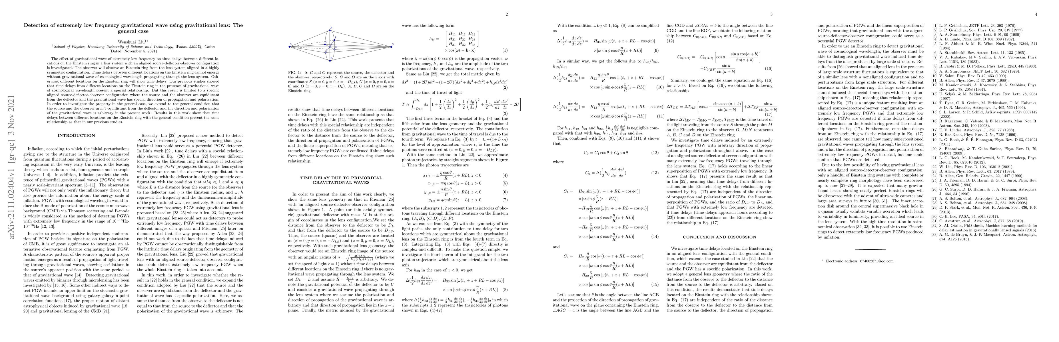 The effect of gravitational wave of extremely low frequency on time delays between different locations on the Einstein ring in a lens system with an aligned source-deflector-observer configuration is investigated. The observer will observe an Einstein ring from the lens system aligned in a highly symmetric configuration. Time delays between different locations on the Einstein ring cannot emerge without gravitational wave of cosmological wavelength propagating through the lens system. Otherwise, different locations on the Einstein ring will show time delays. Our previous studies showed that time delays from different locations on the Einstein ring in the presence of gravitational wave of cosmological wavelength present a special relationship. But this result is limited to a specific aligned source-deflector-observer configuration where the source and the observer are equidistant from the deflector and the gravitational wave has special direction of propagation and polarization. In order to investigate the property in the general case, we extend to the general condition that the source and the observer aren't equidistant from the deflector and the direction and polarization of the gravitational wave is arbitrary in the present work. Results in this work show that time delays between different locations on the Einstein ring with the general condition present the same relationship as that in our previous studies.