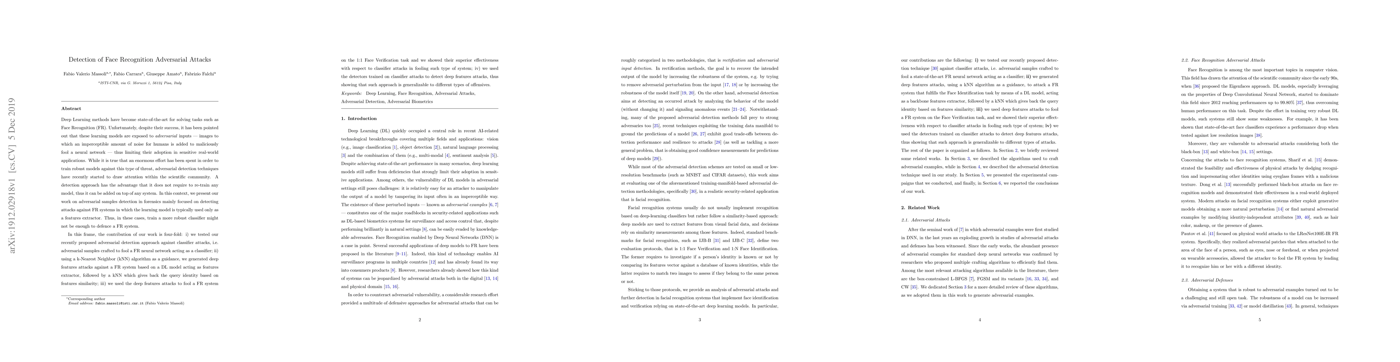 Deep Learning methods have become state-of-the-art for solving tasks such as Face Recognition (FR). Unfortunately, despite their success, it has been pointed out that these learning models are exposed to adversarial inputs - images to which an imperceptible amount of noise for humans is added to maliciously fool a neural network - thus limiting their adoption in real-world applications. While it is true that an enormous effort has been spent in order to train robust models against this type of threat, adversarial detection techniques have recently started to draw attention within the scientific community. A detection approach has the advantage that it does not require to re-train any model, thus it can be added on top of any system. In this context, we present our work on adversarial samples detection in forensics mainly focused on detecting attacks against FR systems in which the learning model is typically used only as a features extractor. Thus, in these cases, train a more robust classifier might not be enough to defence a FR system. In this frame, the contribution of our work is four-fold: i) we tested our recently proposed adversarial detection approach against classifier attacks, i.e. adversarial samples crafted to fool a FR neural network acting as a classifier; ii) using a k-Nearest Neighbor (kNN) algorithm as a guidance, we generated deep features attacks against a FR system based on a DL model acting as features extractor, followed by a kNN which gives back the query identity based on features similarity; iii) we used the deep features attacks to fool a FR system on the 1:1 Face Verification task and we showed their superior effectiveness with respect to classifier attacks in fooling such type of system; iv) we used the detectors trained on classifier attacks to detect deep features attacks, thus showing that such approach is generalizable to different types of offensives.