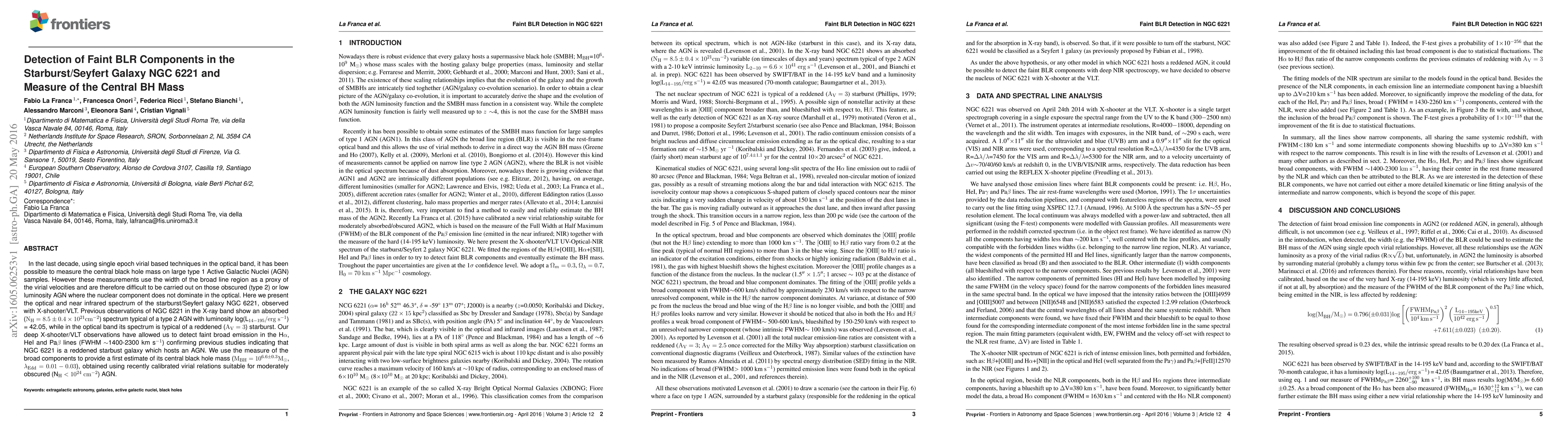 In the last decade, using single epoch virial based techniques in the optical band, it has been possible to measure the central black hole mass on large AGN1 samples. However these measurements use the width of the broad line region as a proxy of the virial velocities and are therefore difficult to be carried out on those obscured (type 2) or low luminosity AGN where the nuclear component does not dominate in the optical. Here we present the optical and near infrared spectrum of the starburst/Seyfert galaxy NGC 6221, observed with X-shooter/VLT. Previous observations of NGC 6221 in the X-ray band show an absorbed (N_H=8.5 +/- 0.4 x 10^21 cm^-2) spectrum typical of a type 2 AGN with luminosity log(L_14-195 keV) = 42.05 erg/s, while in the optical band its spectrum is typical of a reddened (A_V=3) starburst. Our deep X-shooter/VLT observations have allowed us to detect faint broad emission in the H_alpha, HeI and Pa_beta lines (FWHM ~1400-2300 km/s) confirming previous studies indicating that NGC 6221 is a reddened starburst galaxy which hosts an AGN. We use the measure of the broad components to provide a first estimate of its central black hole mass (M_BH = 10^(6.6 +/- 0.3) Msol, lambda_Edd=0.01-0.03), obtained using recently calibrated virial relations suitable for moderately obscured (N_H<10^24 cm^-2) AGN.
