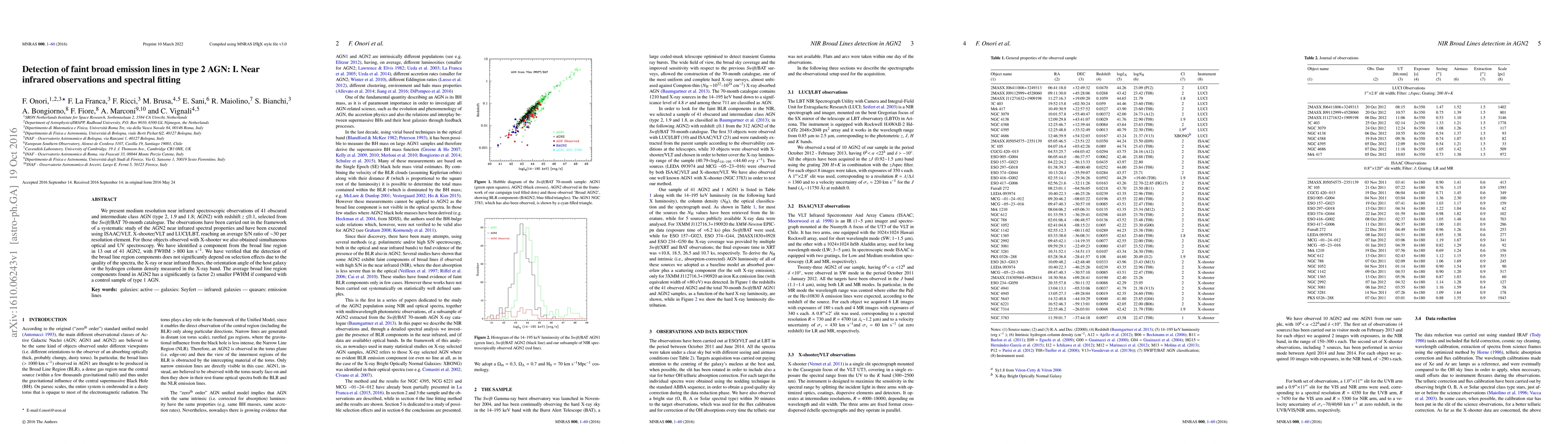 We present medium resolution near infrared spectroscopic observations of 41 obscured and intermediate class AGN (type 2, 1.9 and 1.8; AGN2) with redshift $z \lesssim$0.1, selected from the Swift/BAT 70-month catalogue. The observations have been carried out in the framework of a systematic study of the AGN2 near infrared spectral properties and have been executed using ISAAC/VLT, X-shooter/VLT and LUCI/LBT, reaching an average S/N ratio of $\sim$30 per resolution element. For those objects observed with X-shooter we also obtained simultaneous optical and UV spectroscopy. We have identified a component from the broad line region in 13 out of 41 AGN2, with FWHM ${\rm > 800 }$ km/s. We have verified that the detection of the broad line region components does not significantly depend on selection effects due to the quality of the spectra, the X-ray or near infrared fluxes, the orientation angle of the host galaxy or the hydrogen column density measured in the X-ray band. The average broad line region components found in AGN2 has a significantly (a factor 2) smaller FWHM if compared with a control sample of type 1 AGN.