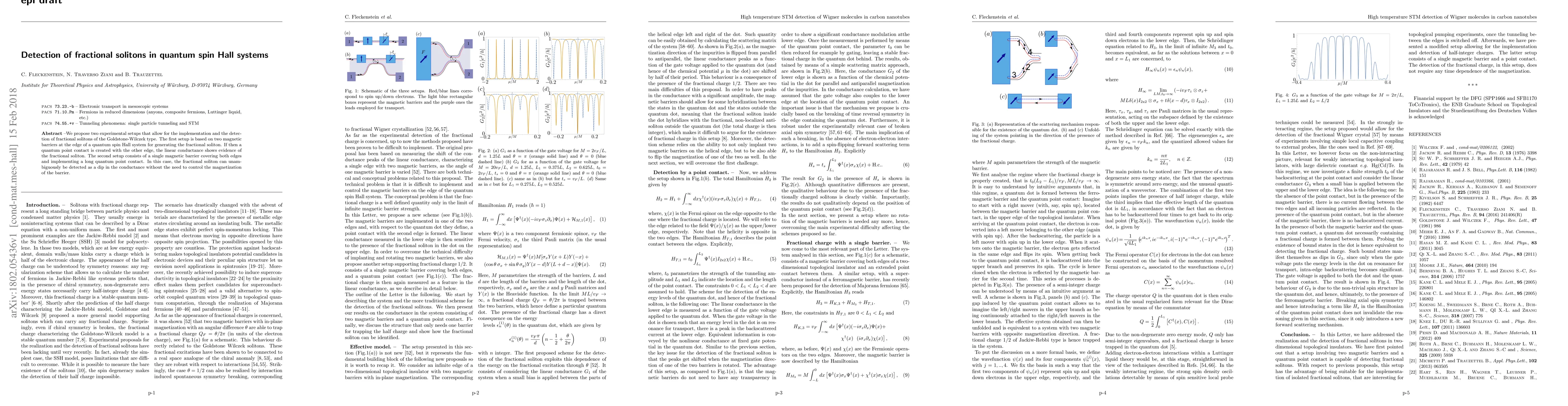 We propose two experimental setups that allow for the implementation and the detection of fractional solitons of the Goldstone-Wilczek type. The first setup is based on two magnetic barriers at the edge of a quantum spin Hall system for generating the fractional soliton. If then a quantum point contact is created with the other edge, the linear conductance shows evidence of the fractional soliton. The second setup consists of a single magnetic barrier covering both edges and implementing a long quantum point contact. In this case, the fractional soliton can unambiguously be detected as a dip in the conductance without the need to control the magnetization of the barrier.