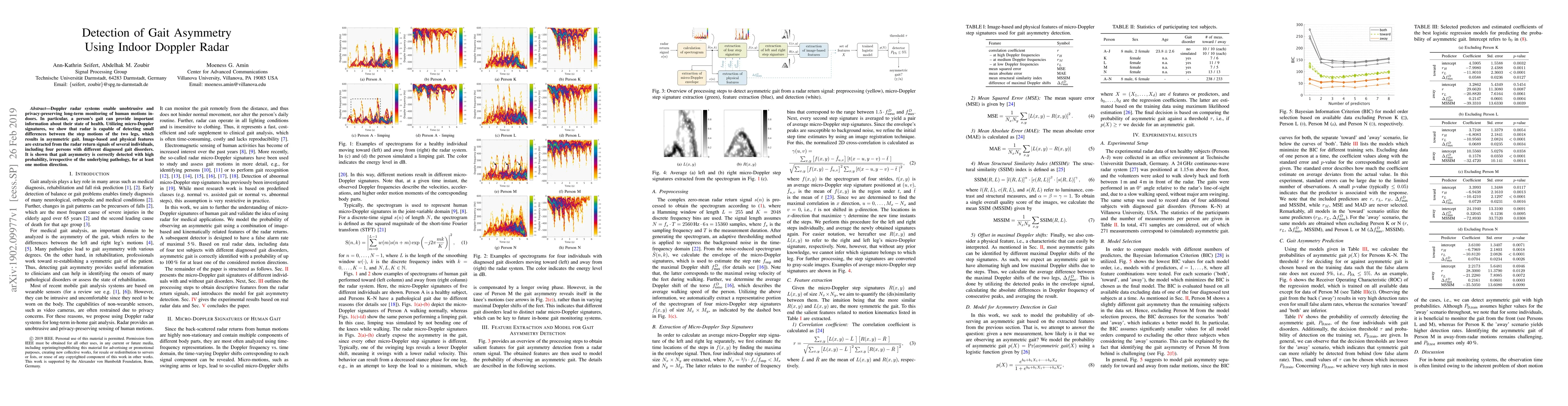 This study demonstrates that indoor Doppler radar can accurately detect gait asymmetry by analyzing micro-Doppler signatures, providing a non-invasive method for long-term health monitoring. The radar successfully identifies small differences in step motions between legs, even in individuals with diagnosed gait disorders.