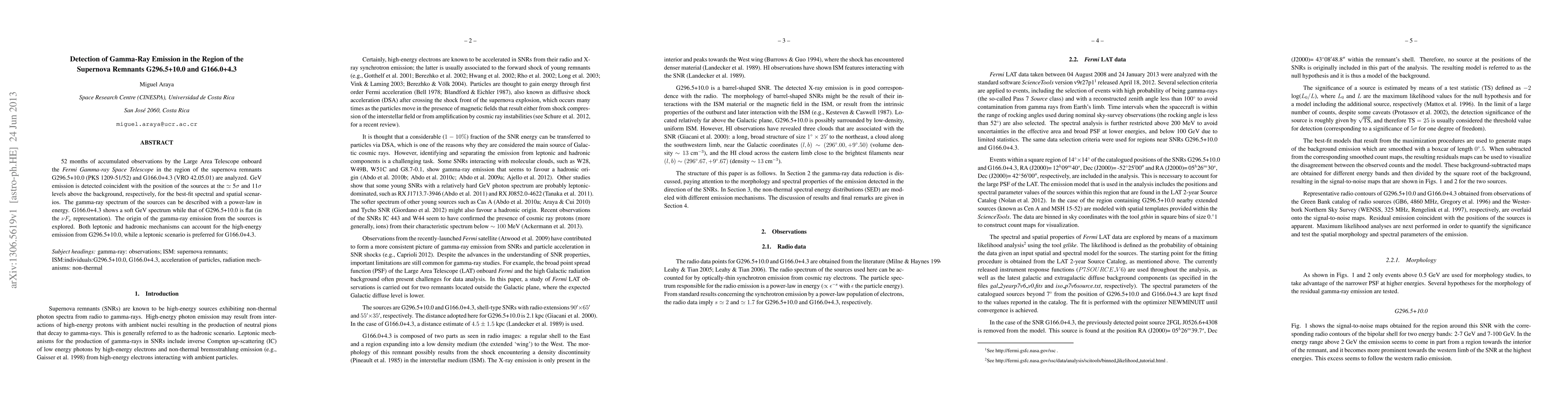 52 months of accumulated observations by the Large Area Telescope onboard the Fermi Gamma-ray Space Telescope in the region of the supernova remnants G296.5+10.0 (PKS 1209-51/52) and G166.0+4.3 (VRO 42.05.01) are analyzed. GeV emission is detected coincident with the position of the sources at the 5-sigma and 11-sigma levels above the background, respectively, for the best-fit spectral and spatial scenarios. The gamma-ray spectrum of the sources can be described with a power-law in energy. G166.0+4.3 shows a soft GeV spectrum while that of G296.5+10.0 is flat (in the "nu-Fnu" representation). The origin of the gamma-ray emission from the sources is explored. Both leptonic and hadronic mechanisms can account for the high-energy emission from G296.5+10.0, while a leptonic scenario is preferred for G166.0+4.3.