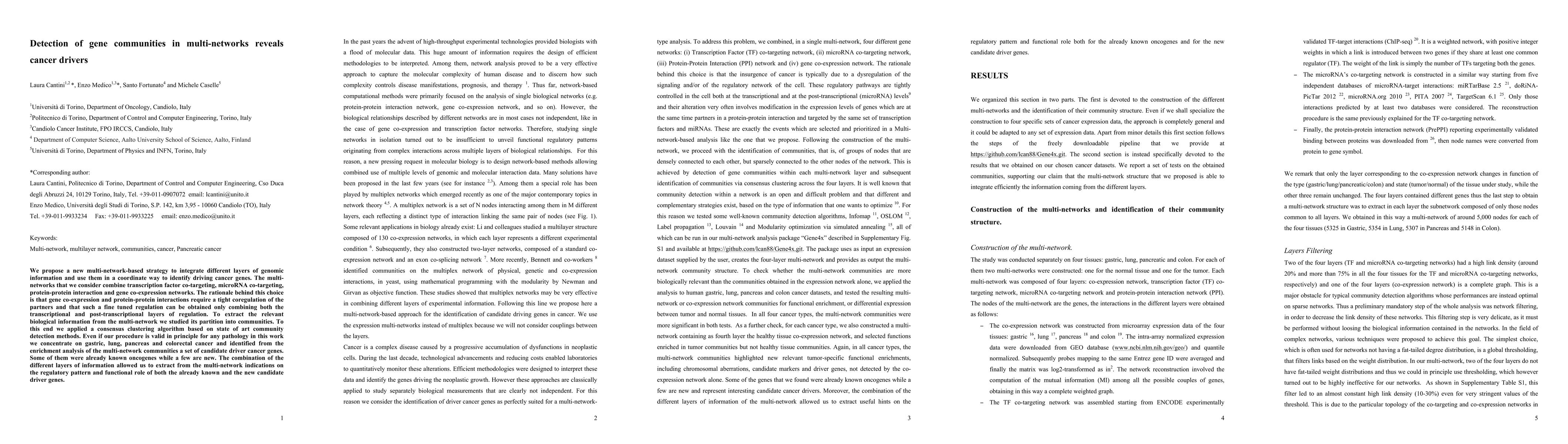 This paper proposes a multi-network strategy to integrate genomic data layers, identifying cancer driver genes through community detection in combined transcription, microRNA, protein-protein interaction, and gene co-expression networks. The approach identifies both known and new candidate driver genes across gastric, lung, pancreas, and colorectal cancers.