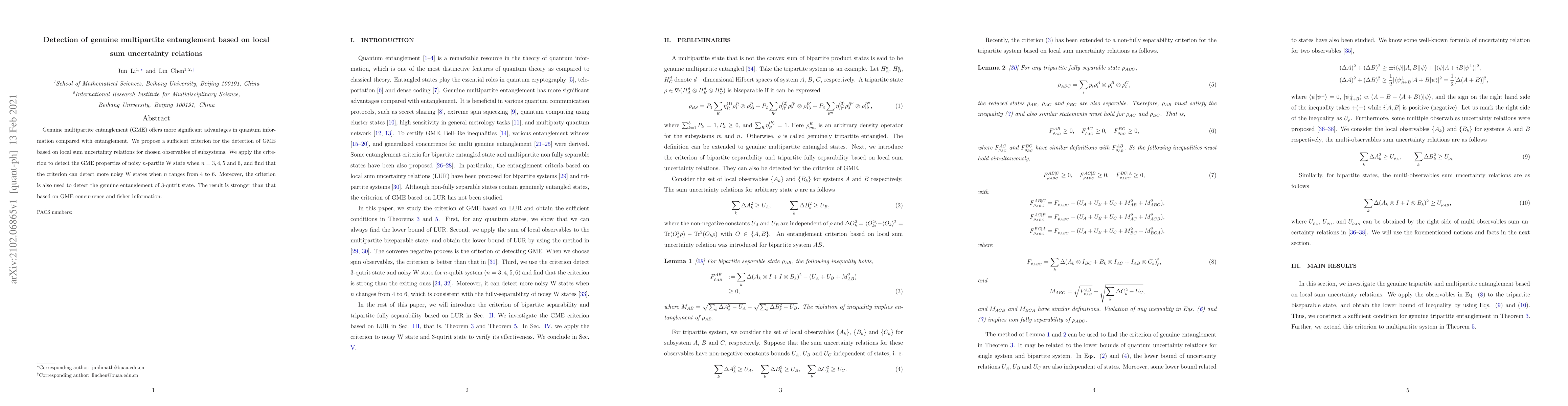 This paper proposes a new criterion for detecting genuine multipartite entanglement (GME) based on local sum uncertainty relations. The criterion is successfully applied to detect GME in noisy $n$-partite W states for $n = 3, 4, 5,$ and $6$, showing enhanced detection capabilities for $n$ from 4 to 6, and also identifies genuine entanglement in a $3$-qutrit state, outperforming existing methods.