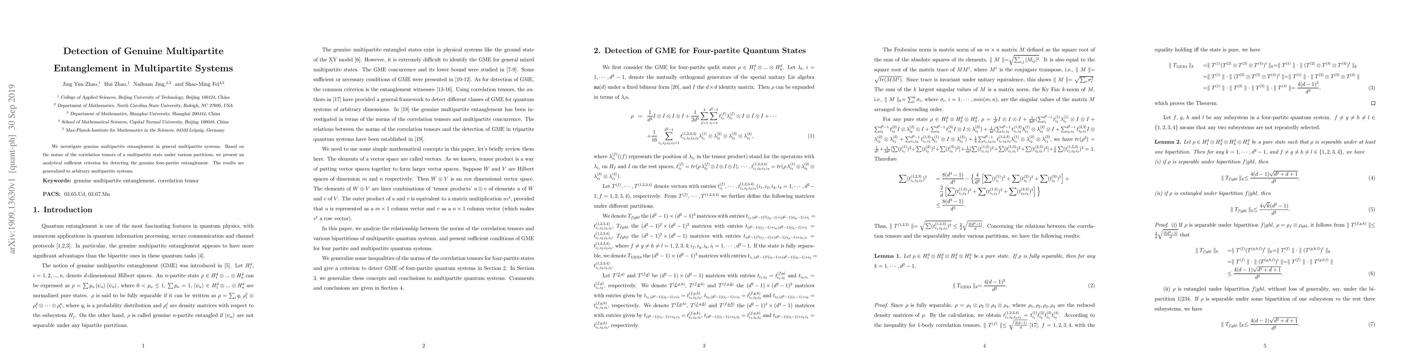 Summary: This paper presents an analytical criterion for detecting genuine multipartite entanglement based on correlation tensors. The method is shown to be effective for four-partite systems and is generalized for use in any multipartite system.