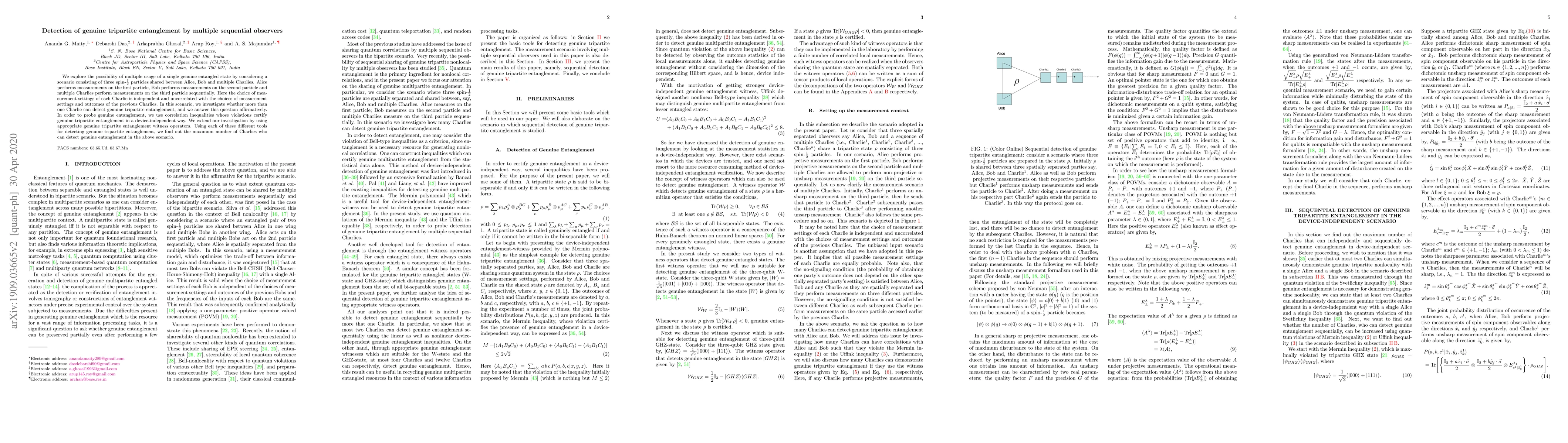 This paper explores the detection of genuine tripartite entanglement in a sequence of measurements by Alice, Bob, and multiple Charlies on three spin-$\frac{1}{2}$ particles. It affirmatively answers the question of whether more than one Charlie can detect genuine entanglement, using correlation inequalities and entanglement witness operators to certify entanglement in a device-independent manner.